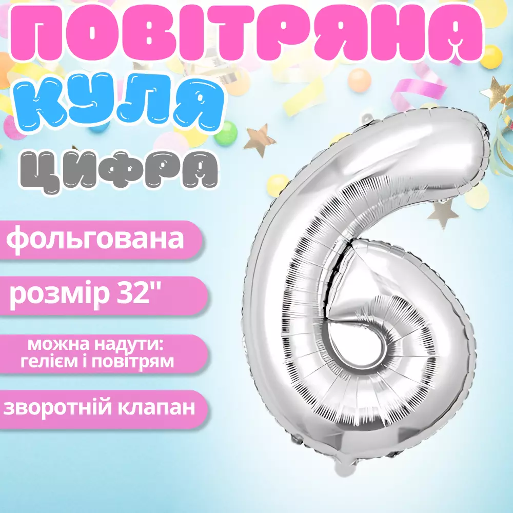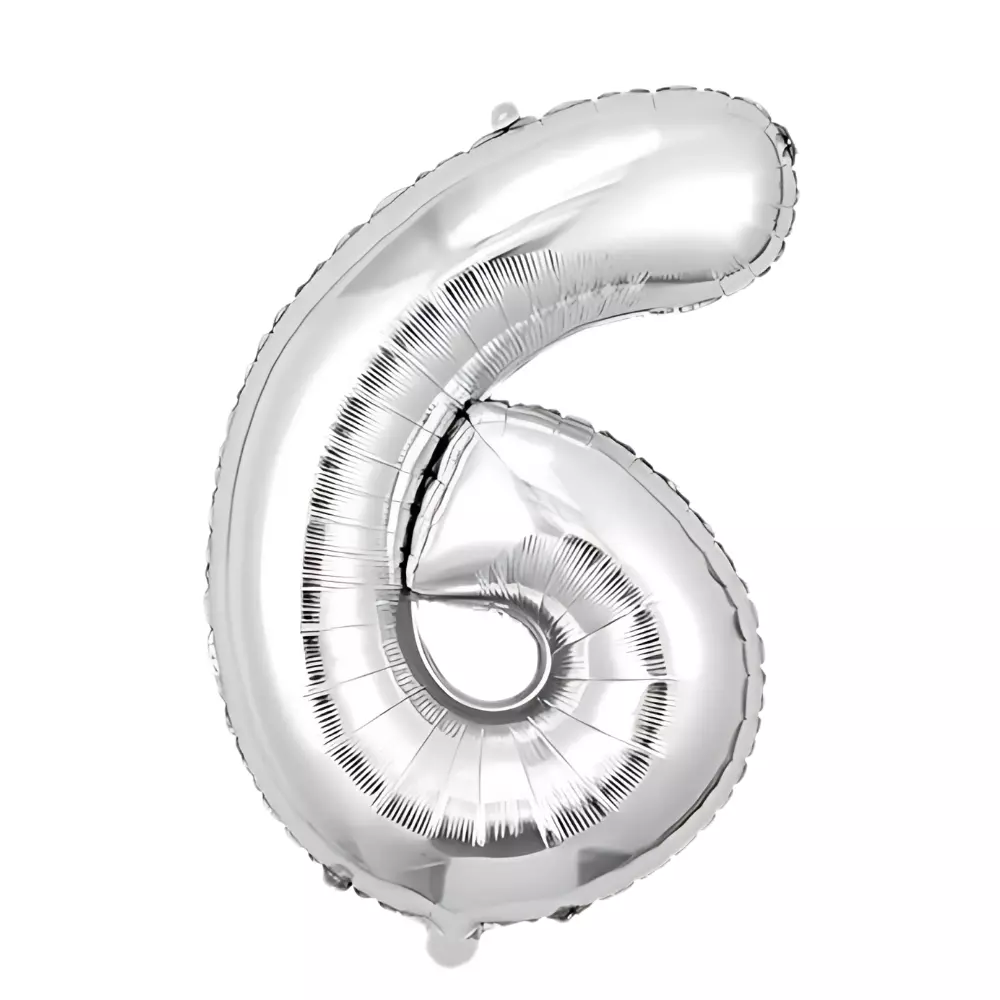 Фольгована повітряна куля у формі цифри «6» сріблястого кольору -