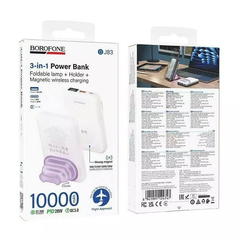 Power Bank Borofone BJ83 Magnetic 22.5W - современный портативный аккумулятор с поддержкой быстрой и беспроводной магнитной зарядки, который идеально подходит для ежедневного использования. Модель оснащена аккумулятором 10000 mAh, что позволяет заряжать смартфон 1-2 раза в зависимости от модели устройства. Поддержка быстрой зарядки до 22.5W обеспечивает быстрое восстановление заряда смартфонов, планшетов, наушников и других гаджетов. Одним из преимуществ является магнитная беспроводная зарядка, совместимая со смартфонами, поддерживающими такой вид зарядки. Power bank надежно фиксируется на корпусе смартфона, обеспечивая стабильную зарядку без кабелей. Встроенная подставка позволяет удобно разместить смартфон и одновременно работает как LED-ночник для комфортного использования в темное время суток. Также модель имеет LED-дисплей уровня заряда, который в процентах показывает остаток энергии. Цифровой дисплей позволяет точно контролировать заряд павербанка и своевременно ставить его на подзарядку.