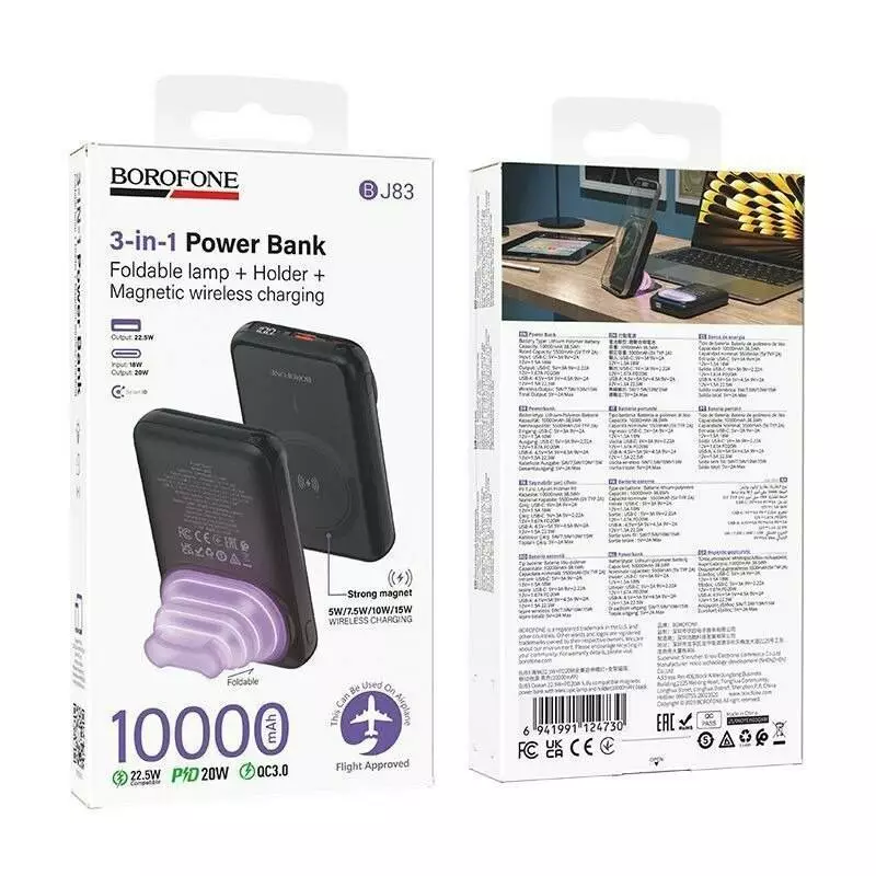 Power Bank Borofone BJ83 Magnetic 22.5W - современный портативный аккумулятор с поддержкой быстрой и беспроводной магнитной зарядки, который идеально подходит для ежедневного использования. Модель оснащена аккумулятором 10000 mAh, что позволяет заряжать смартфон 1-2 раза в зависимости от модели устройства. Поддержка быстрой зарядки до 22.5W обеспечивает быстрое восстановление заряда смартфонов, планшетов, наушников и других гаджетов. Одним из преимуществ является магнитная беспроводная зарядка, совместимая со смартфонами, поддерживающими такой вид зарядки. Power bank надежно фиксируется на корпусе смартфона, обеспечивая стабильную зарядку без кабелей. Встроенная подставка позволяет удобно разместить смартфон и одновременно работает как LED-ночник для комфортного использования в темное время суток. Также модель имеет LED-дисплей уровня заряда, который в процентах показывает остаток энергии. Цифровой дисплей позволяет точно контролировать заряд павербанка и своевременно ставить его на подзарядку.