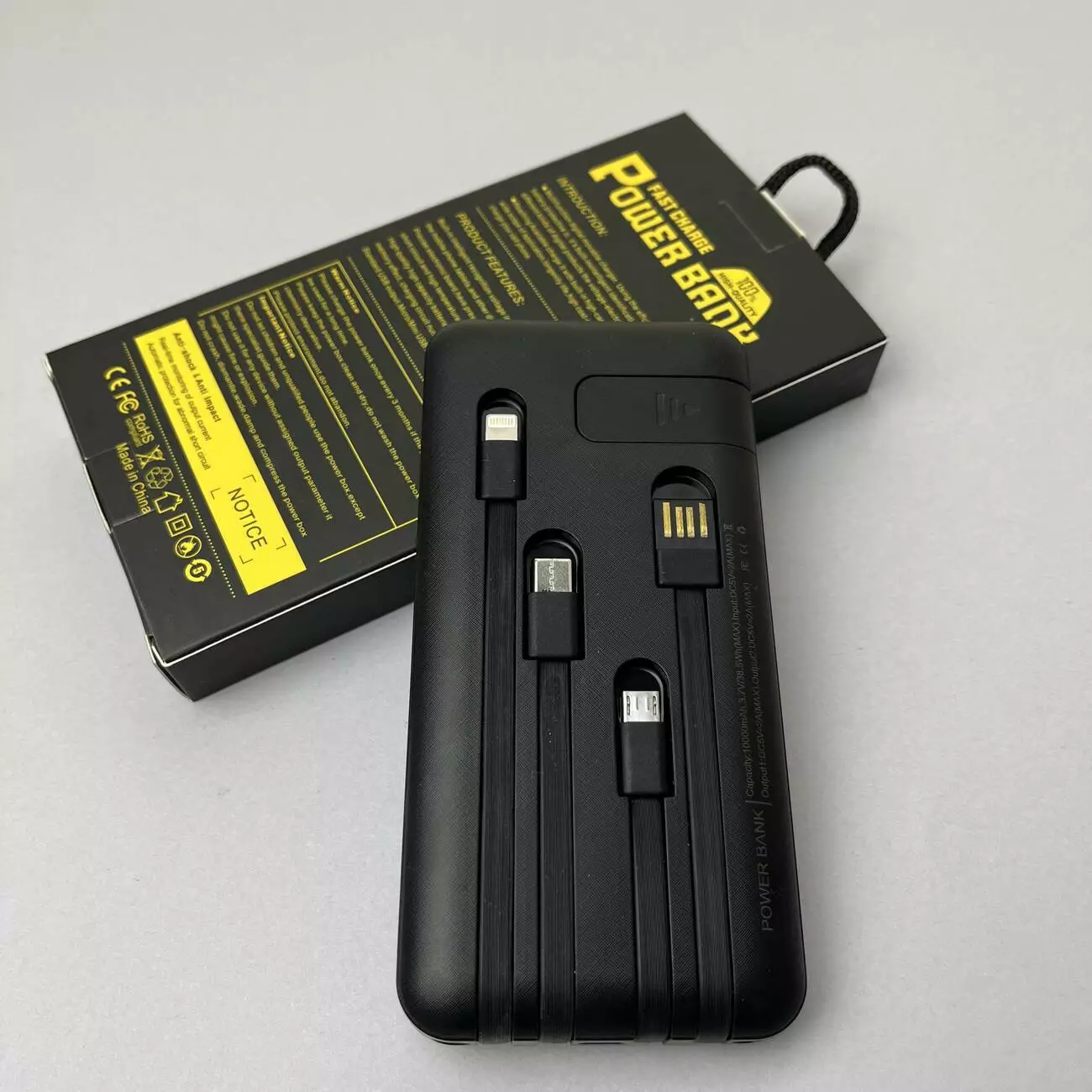 Power Bank Box LED з кабелем USB+Micro+Type-C+Lightning (10000mAh) - Портативний зарядний пристрій Power Bank Box поєднує в собі 4 варіанта кабеля для заряджання ваших пристроїв, ліхтарик, висувний фіксатор. Зовнішнє джерело живлення Power Bank має функцію енергозбереження в режимі очікування, а світлодіодний індикатор дозволяє тримати на контролі рівень заряду пристрою. Відмінний варіант для подорожей або на повсякдення.