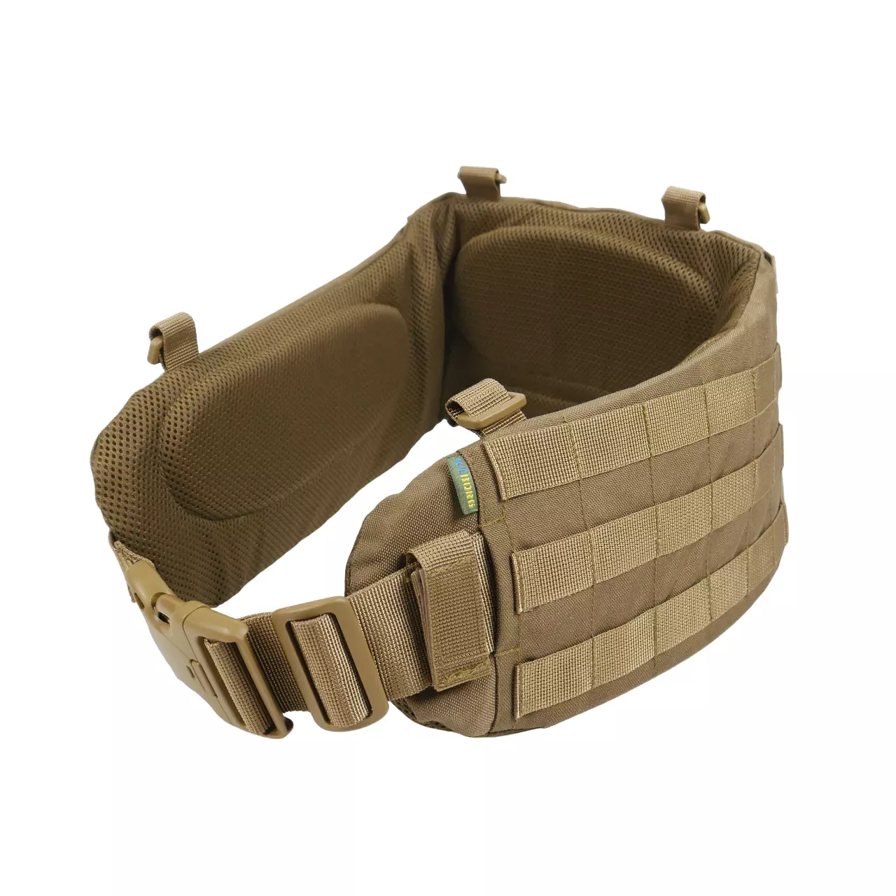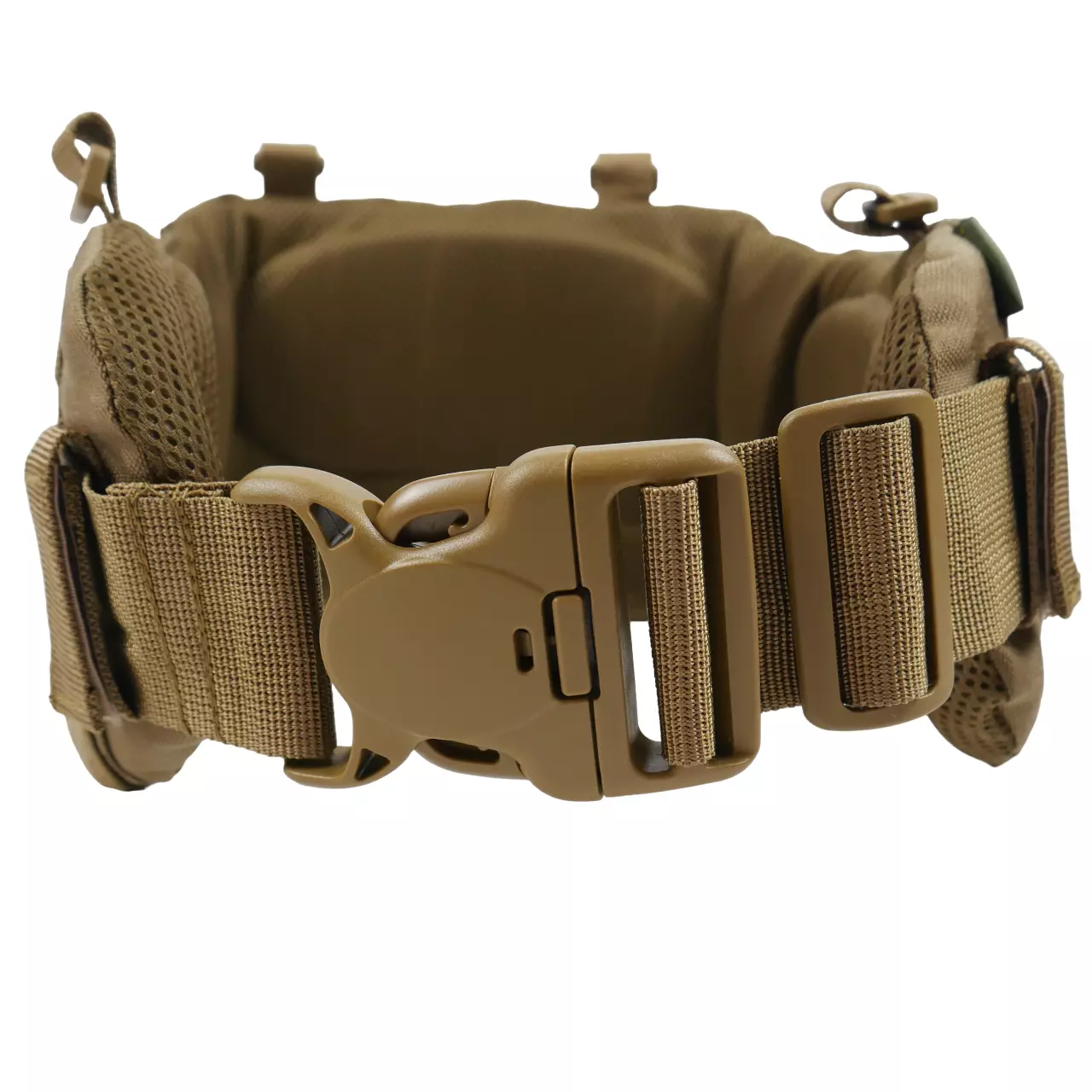 На боковых частях три ряда системы molle для крепления итогов или дополнительного снаряжения. Задняя часть увеличена и выполнена с 4-мя рядами molle, что позволяет максимально снарядить пояс необходимым снаряжением. Регулировка пояса происходит в 2 стороны благодаря специальному двухщелевому фастексу WJ, и скрытым двухщелям в самом поясе.