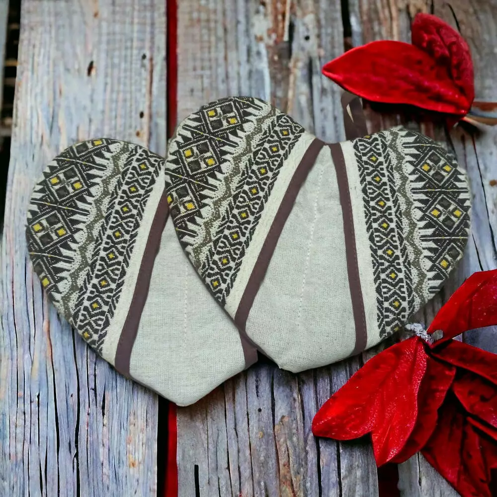 Эта сердцеподобная прихватка непременно пригодится на кухне заботливой хозяйки! Особенно если кухне свойственны черты этно стиля. Мягкий наполнитель между двух слоев износостойкой, хотя и тонкой ткани позволяет этому аксессуару длительное время выдерживать трудовые будни. Прихватка удобна в использовании , поскольку запросто складывается пополам по продольной строчке. Благодаря текстильной петельке она всегда будет около варочной поверхности.