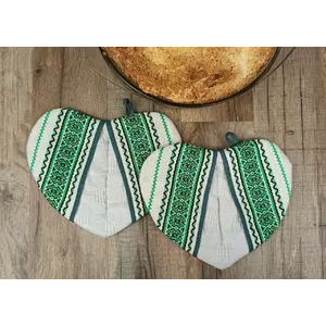 Эта сердцеподобная прихватка непременно пригодится на кухне заботливой хозяйки! Особенно если кухне свойственны черты этно стиля. Мягкий наполнитель между двух слоев износостойкой, хотя и тонкой ткани позволяет этому аксессуару длительное время выдерживать трудовые будни. Прихватка удобна в использовании , поскольку запросто складывается пополам по продольной строчке. Благодаря текстильной петельке она всегда будет около варочной поверхности.