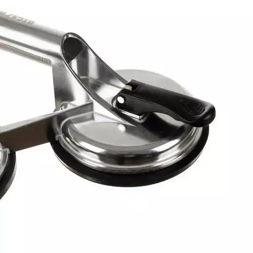 МЕХАНІЗМ ВСМОКТУВАННЯ ТИСКУ - присоски, що використовуються в ручці, підходять для перенесення всіх матеріалів з плоскими і газонепроникними поверхнями, таких як скло, пластик, метал, дерево з покриттям, мармур і т. д. Гумова присоска механічно затягується важелем.
