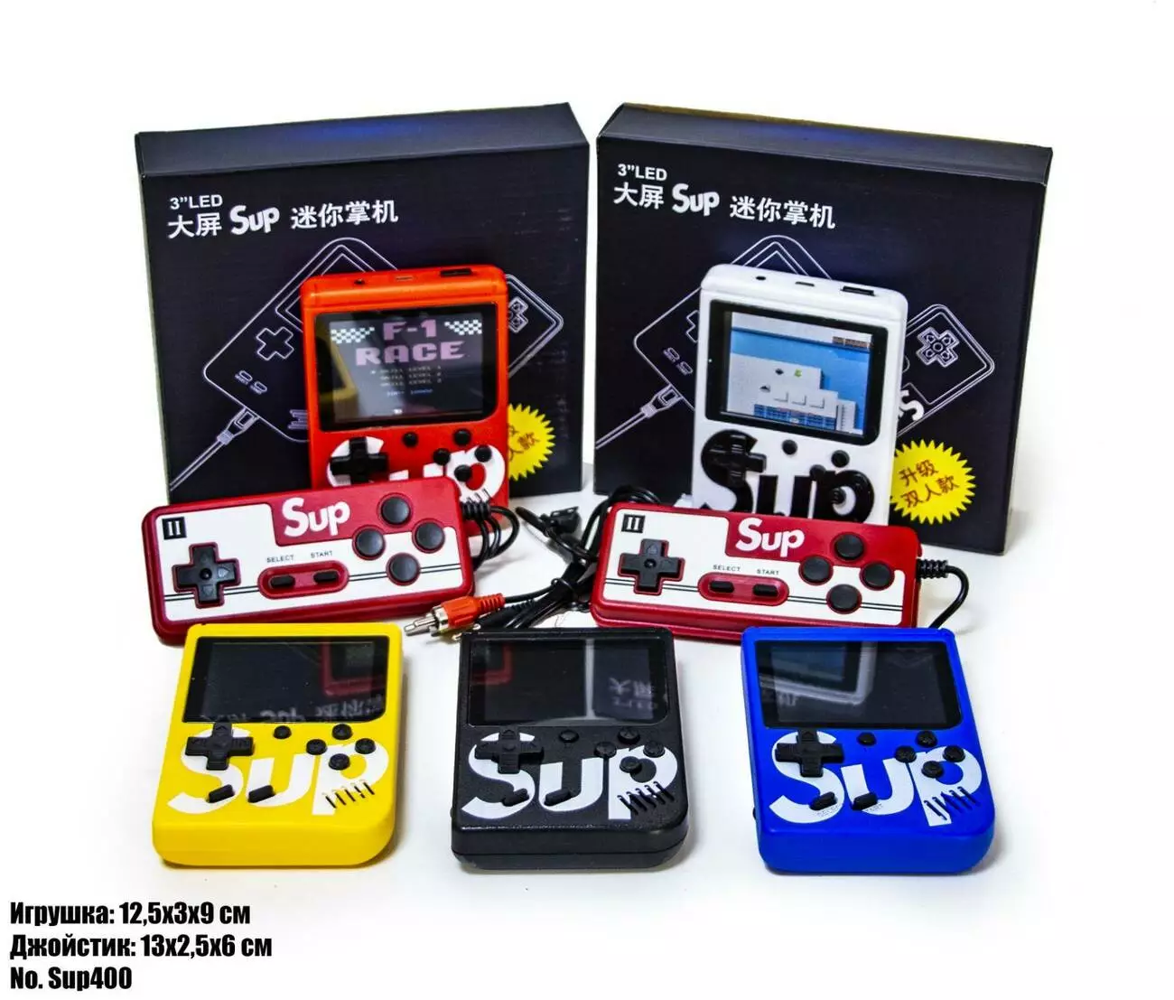 <p><strong>Приставка с джойстиком GAME SUP </strong></p><br /> <p>Игровая консоль Game SUP - это прекрасное развлечение для детей и взрослых. В нее встроено 400 популярных встроенных 8-битных игр. Можно играть вдвоем или одному. Игрушка легко поместится в карман. Можно подключить к телевизору.</p><br /> <p>Платформеры, головоломки, стрелялки, стратегии – каждый игровой жанр обширно представлен в огромной библиотеке классических мини–игр Game Box (Super Mario, Чип и Дейл, Танчики, Черепашки ниндзя, Контра, Мортал Комбат, Гонки F1 и другие игрушки, которые не оставят равнодушными никого.</p><br /> <p><strong>Характеристики</strong>:</p><br /> <ul><br /> <li>400 игр;</li><br /> <li>Цветной экран и качественный звук;</li><br /> <li>Можно играть вдвоем;</li><br /> <li>Материал корпуса: пластик;</li><br /> <li>Кнопки, как на джойстике от Dendy;</li><br /> <li>Легко помещается даже в карман;</li><br /> <li>Можно подключить к большому экрану и играть на телевизоре;</li><br /> <li>Съёмный аккумулятор — легко поменять;</li><br /> <li>Цвет консоли: черный (как на 1й фотографии);</li><br /> <li>Цвет джойстика: красный (как на 1й фотографии);</li><br /> <li>Зарядка от Micro USB;</li><br /> <li>Дисплей: цветной LCD, 3 дюйма;</li><br /> <li>Батарея: BL-5C на 1000 (до 6 часов игры);</li><br /> <li>Рамеры (ДхШхВ): 115 х 79 х 22 мм.</li><br /> </ul><br /> <p><strong>Комплектация</strong>:</p><br /> <ul><br /> <li>Консоль;</li><br /> <li>Джойстик;</li><br /> <li>Зарядный кабель</li><br /> <li>Кабель подключения к телевизору (AV).</li><br /> </ul><br /> <p>*Цвет и оттенок изделия на фотографии может отличаться от реального. Комплектация товара может изменяться производителем без уведомления. Магазин не несет ответственности за изменения, внесенные производителем</p><br />