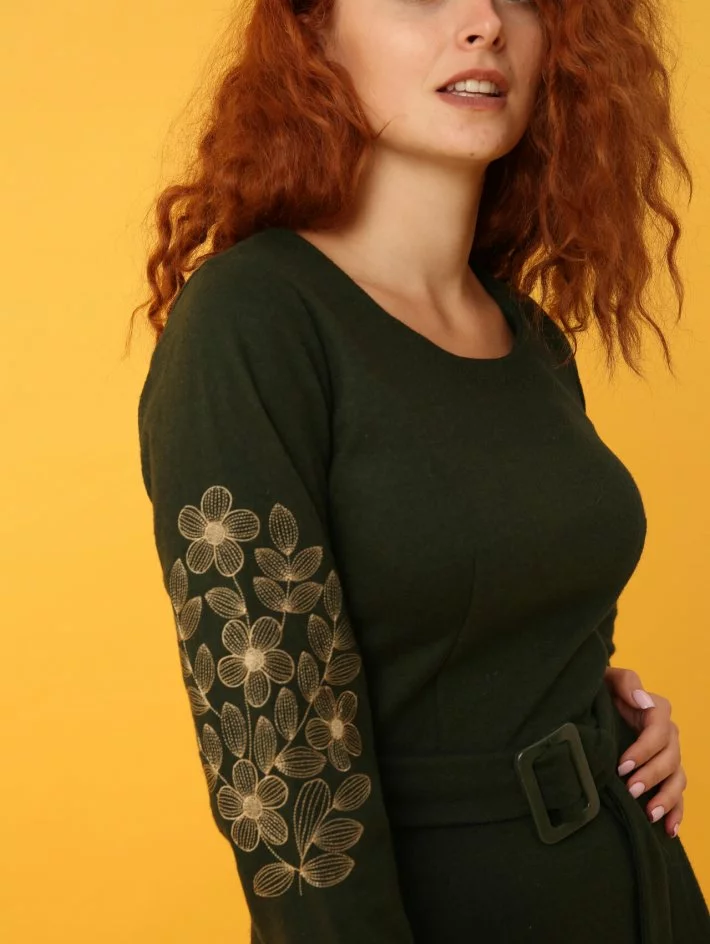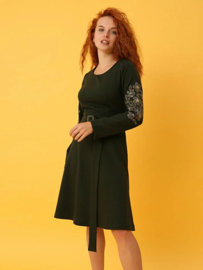 Приталена сукня з в'яленої вовни з круглою горловиною і вишивкою на