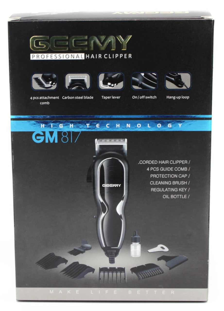 Hair Trimmer GM-817 Gemei оснащена бесшумным и мощным анкерным вибродвигателем. Позволяет в домашних условиях сделать модную прическу, или поддерживать ее, без услуг парикмахера. Ножи рабочего механизма изготовлены из нержавеющей стали и заточены с помощью лазерной заточки кромки лезвий, благодаря чему срез получается намного ровнее.  Машинка для стрижки волос незаменимая вещь для тех, кто следит за своей внешностью!