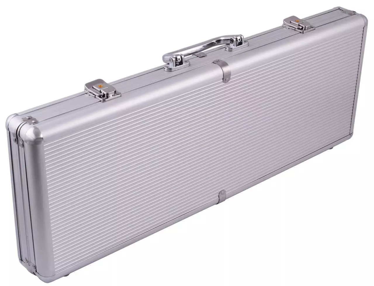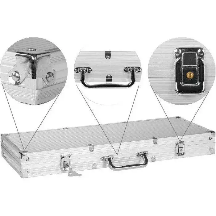 Полноценный покерный набор в прочном алюминиевом кейсе — отличный выбор для домашних турниров, вечеринок с друзьями и активного отдыха. Удобный чемодан с металлической ручкой и замками надёжно защищает содержимое и позволяет легко брать комплект с собой.