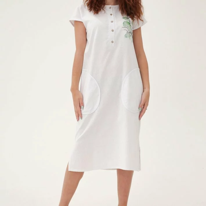 Дизайнерська сукня з цікавою вишивкою із білого льону. Попереду по