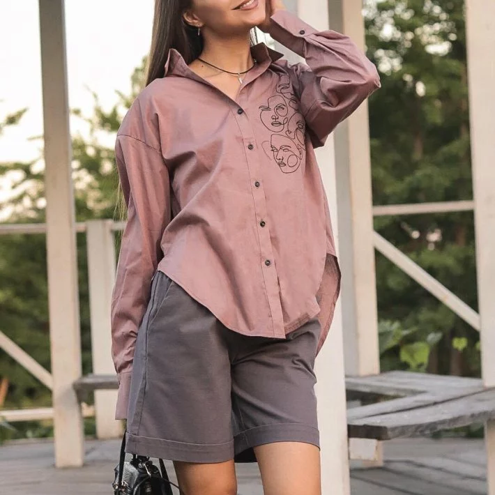 Класична сорочка в нюдовому кольорі, оздоблена вишивкою.
