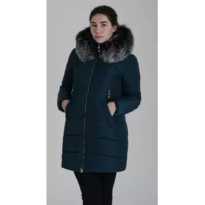 Пуховик женский зимний полуприталенного силуэта.Съемный капюшон с искусственной опушкой ЧЕРНОБУРКА. Опушка также съемная (на кнопках).Молния с крупными звеньями по центру и на верхних карманах.Нижний карман - настрочная листочка с большим люверсом черного цвета.Всего на пуховике 4 кармана.Низ изделия ровный.Используется утеплитель силикон плотностью 300.Ткань канада.