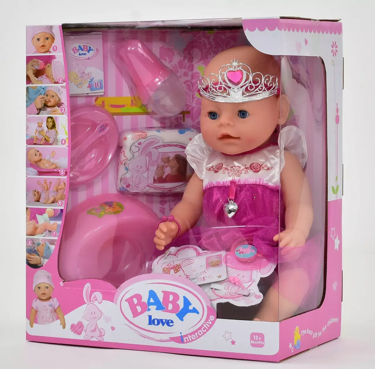 Чарівний пупс Baby Love - аналог всесвітньо відомого бренду Baby born - кращий подарунок для дівчинки! Даний набір стане відмінним приводом не нудьгувати та підійде для дітей від року. Милий пупс має безліч функцій, які роблять його схожим з цим немовлям. Серед таких функцій виділяють наступні: 1. Можливість купання. Сама лялька виконана з твердих матеріалів, які дозволяють її купати в цій воді. 2. Крім цього, пупс вміє пити з пляшечки. 3. Годувати пупса-немовляти можна з тарілочки. 4. У комплект також входить підгузок в який малюк буде мочитися, якщо попередньо напоїти його з пляшечки. 5. Функція ходіння на горщик здійснюється шляхом натискання на пупок. Для цього необхідно попередньо роздягнути ляльку і посадити її на горщик. 6. Якщо натиснути на ручку немовляти, з його очей поллються сльози. Плач не супроводжується звуковими ефектами. 7. Ручки та ніжки пупсика рухливі. 8. Сон. Очі ляльки закриваються, якщо її покласти на спину. Для виконання всіх функцій, пупс додатково комплектується набором необхідних аксесуарів, які допоможуть дівчинці доглядати за ним: • горщик, • тарілка з ложкою, • пляшечка для годування, • підгузок, • пустушка, • браслетики, • ID-картка. Вісім функцій пупса 018 C і набір аксесуарів дозволяють розігрувати найрізноманітніші сюжетно-рольові ігри, при цьому вчитися турботі й відповідальності та просто проводити час весело і невимушено!