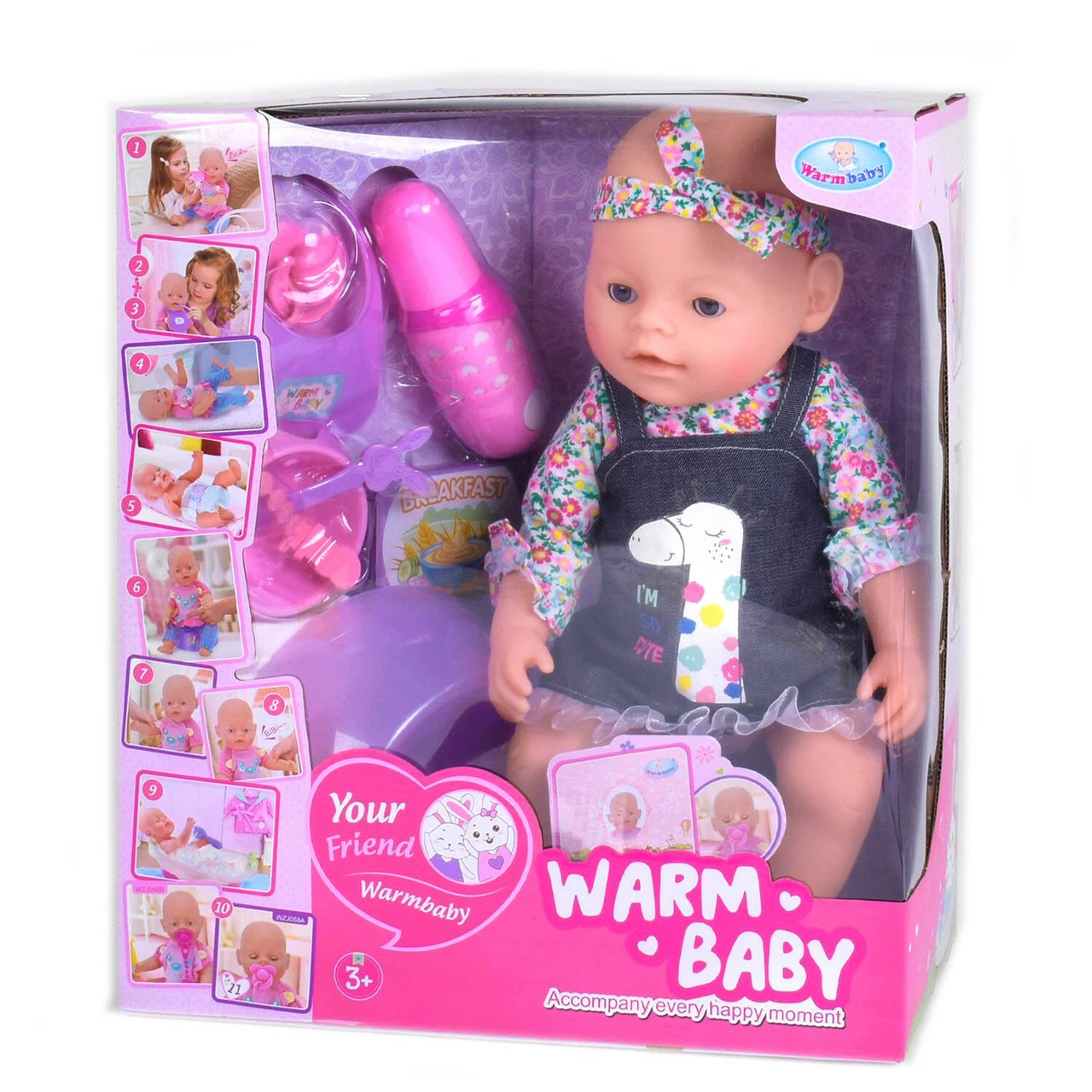 Милый пупс покорит сердце любой девочки. Вместе с ним игра в дочки-матери станет не только увлекательной, но и развивающей для ребенка. Пупс с подвижными ножками и ручками в необычном и очень ярком костюме идет в комплекте с первостепенными аксессуарами для ухода. В пупсика входят следующие функции: