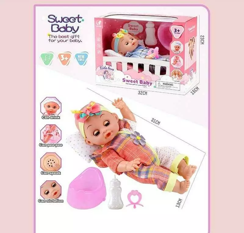Головна > Каталог > Іграшки > Ляльки > Пупс WD 2321 AB (36/2) 2 види, висота 27 см, звукові ефекти, сміх та плач, п’є, ходить на горщик, заплющує очі, горщик, пляшечка, подушка, в коробці оптом