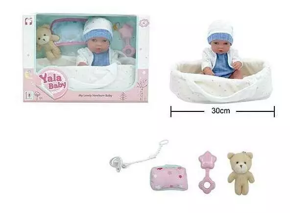 Головна > Каталог > Іграшки > Ляльки > Пупс YL 2512 D-A (24) гумовий, висота 30 см, кокон з ручками, подушечка, брязкальце, пустушка, ведмедик, в коробці оптом