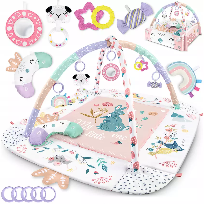 Вот почему мы прикрепляем к коврику многофункциональные игрушки, которые вы можете повесить на оголовье — пусть что-то гремит, а что-то шуршит! Среди игрушек есть даже скрипучая игрушка-милая погремушка!