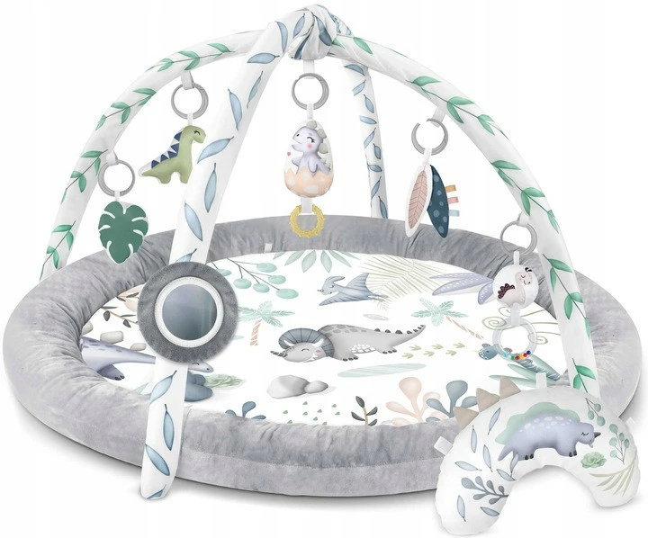 Поэтому мы добавили к коврику многофункциональные игрушки, которые можно повесить на дуги - пусть что-то стучит, звенит и шуршит! Среди игрушек есть даже пищащая игрушка - динозавр и ископаемое!