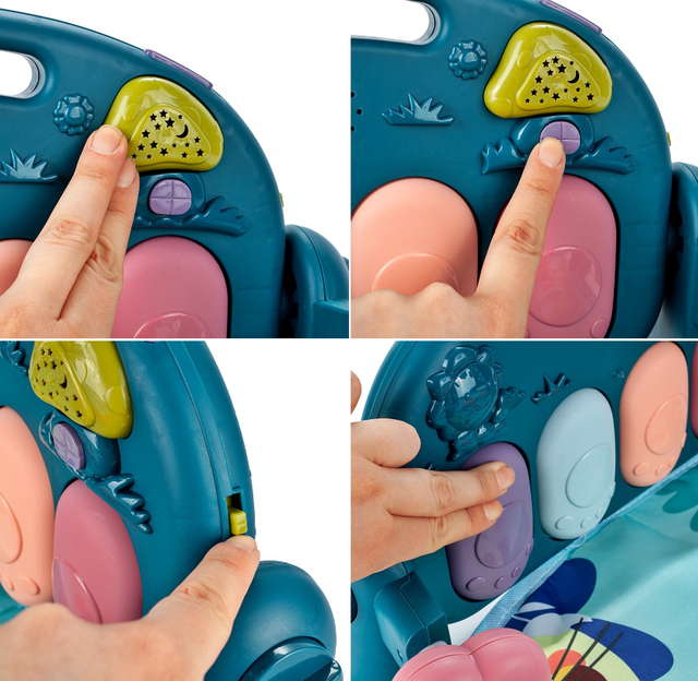• Первый: оголовье устанавливается вертикально над ковриком, пианино перпендикулярно коврику, так что малыш, двигая ножками, ударяет по клавишам пианино, вызывая радостные звуки и свет, а лежащий на спине ребенок может играть с погремушками, подвешенными на оголовье,