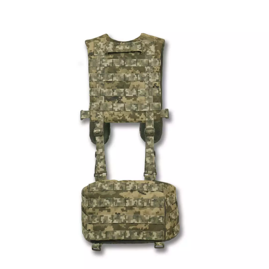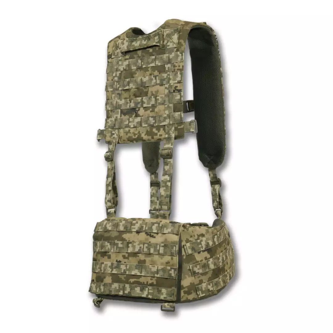 Конструкция. Плечевые лямки имеют рюкзачную конструкцию с ячейками MOLLE на спине для закрепления дополнительных итогов. Имеет внутренний слой полифома толщиной 5 мм и мягкую сетку для вентиляции. На лямках предусмотрено по 7 рядов MOLLE и нагрудный соединительный ремень на фастексе.