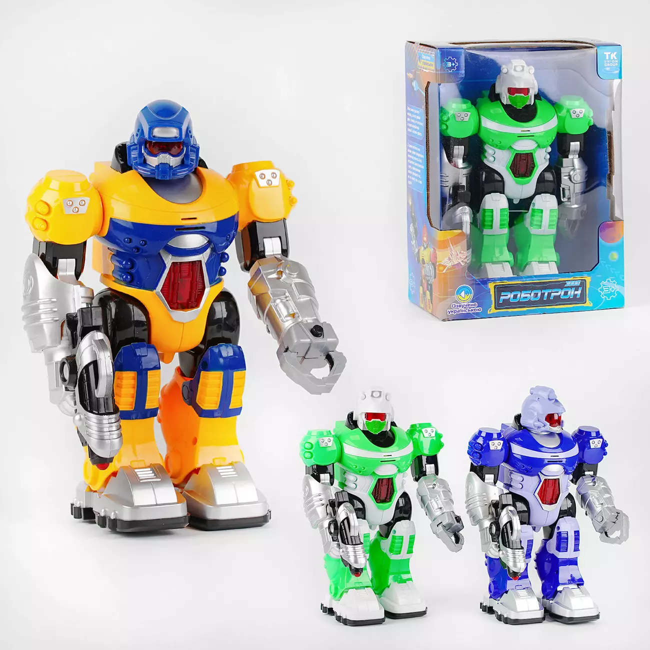 Настав час ближче познайомитись з неймовірними роботами від бренду “TK Group”. Ця іграшка перенесе свідомість дитини у неймовірний світ, де роботи виступають захисниками людей. Робот - це не просто іграшка, це справжній друг та рятівник, з яким можна побалакати та відправитись у чарівну подорож! Особливості: - іграшка представлена у трьох кольорах; - кожна деталь робота промальована та позначена різними кольорами; - на лівій руці робота є кнопка, яка відповідає за рух своєрідних пальців; - для того, щоб активувати робота необхідно додати 3 батарейки типу АА (до комплекту не входять); - на спині у робота є кнопка вімк/вимк; - при вмиканні іграшки очі робота світяться, також світиться живіт та автомат у правій руці; - робот ходить та каже слова українською мовою.