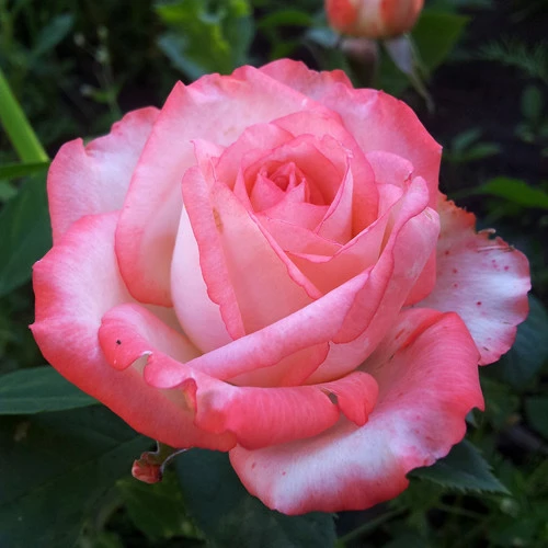 Необычная окраска и порой необъяснимое сочетание цветов двухцветных роз всегда привлекает особое внимание. К таким необычным розам можно отнести двухцветную розу сорта Блаш, которая отличается контрастным сочетанием цветов, но благодаря мягкому переходу достигается особая гармоничность цветов.Края лепестков обрамлены розовой каемкой, которая по направлению к центру лепестка становится более светлой и плавно переходит в  кремово-белый цвет.