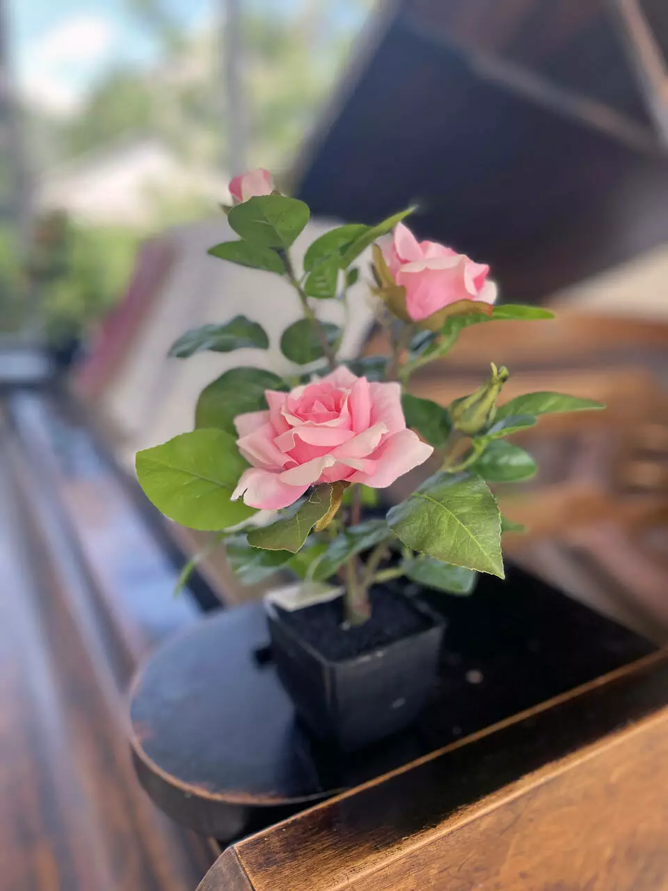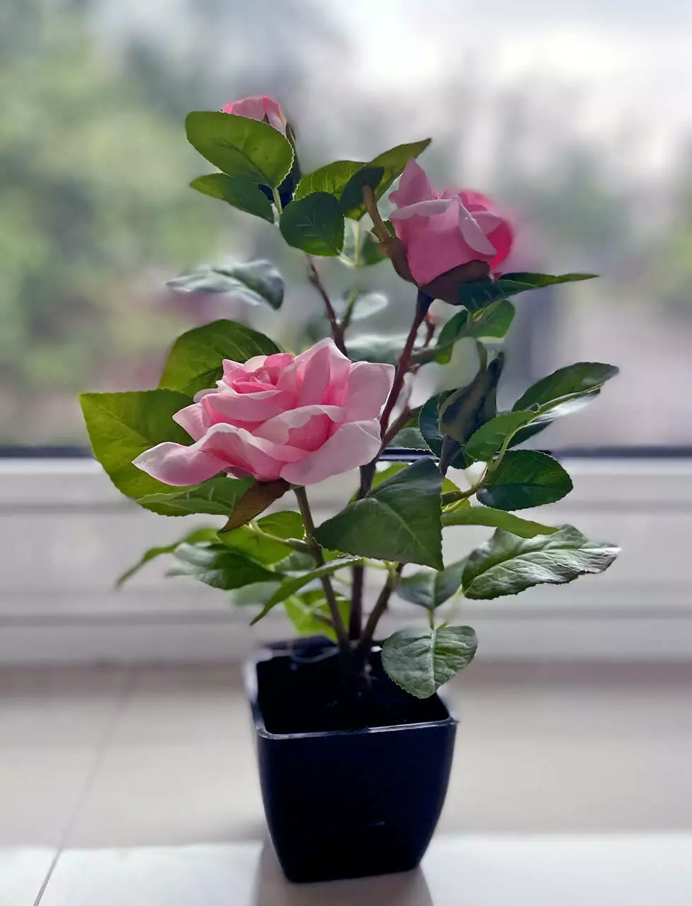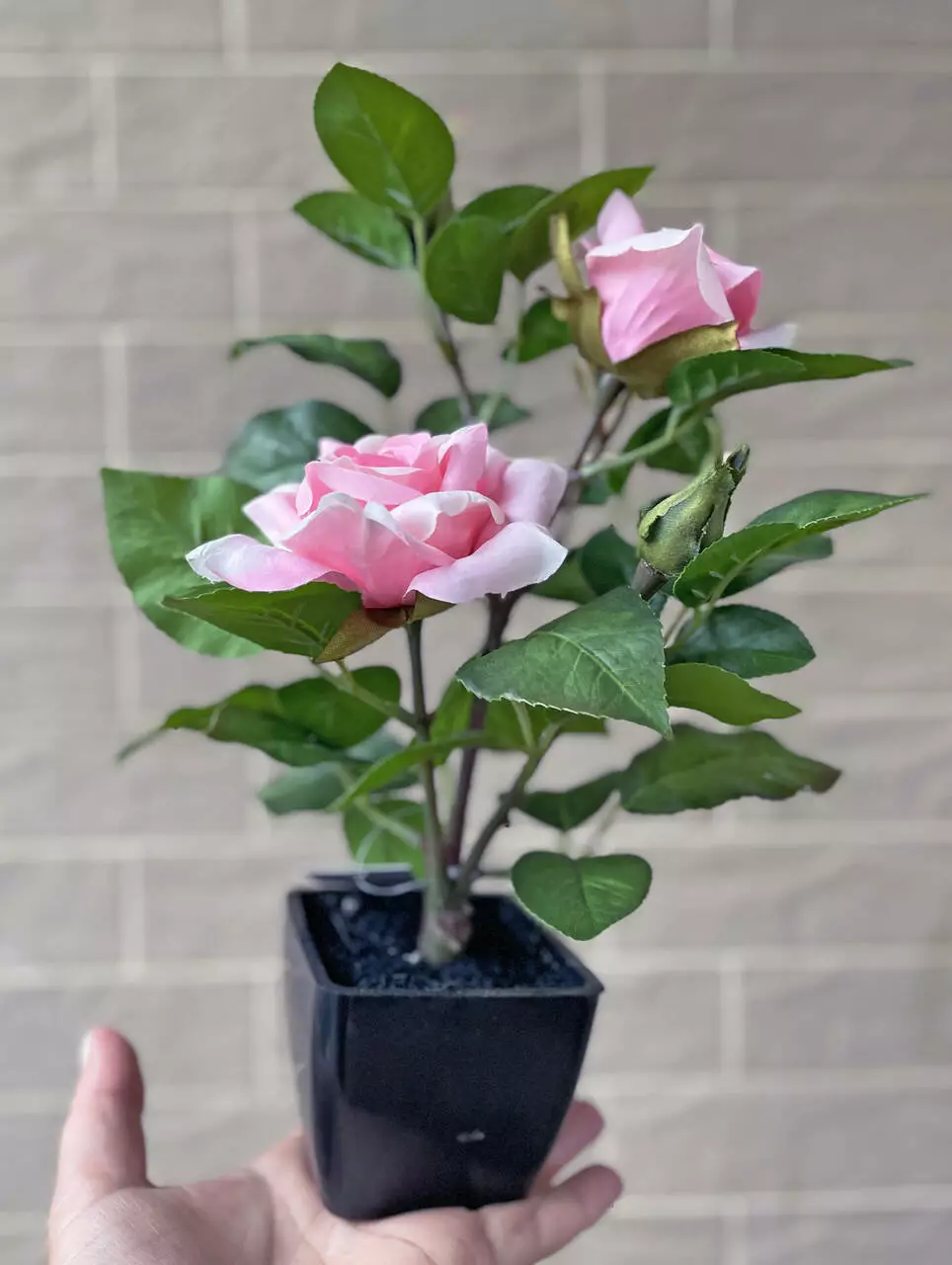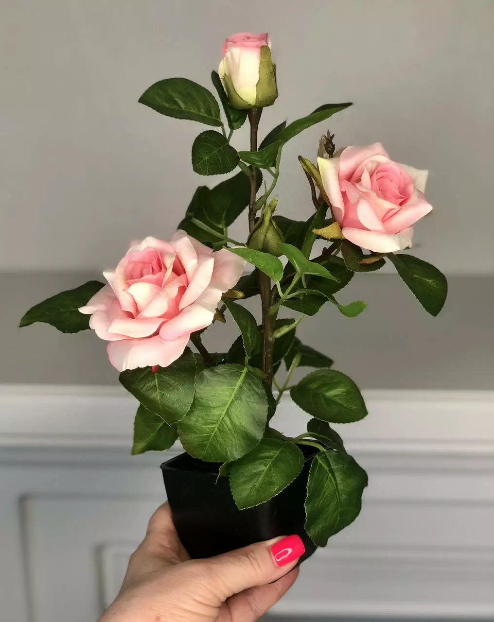 Милый кустик розовой розы добавит вашему пространству эстетики и уюта. Благодаря компактным размерам, этот вазон можно разместить где угодно. Высота вместе с горшком составляет 29 см. Роза имеет три цветка и бутон, которые выглядят как живые.