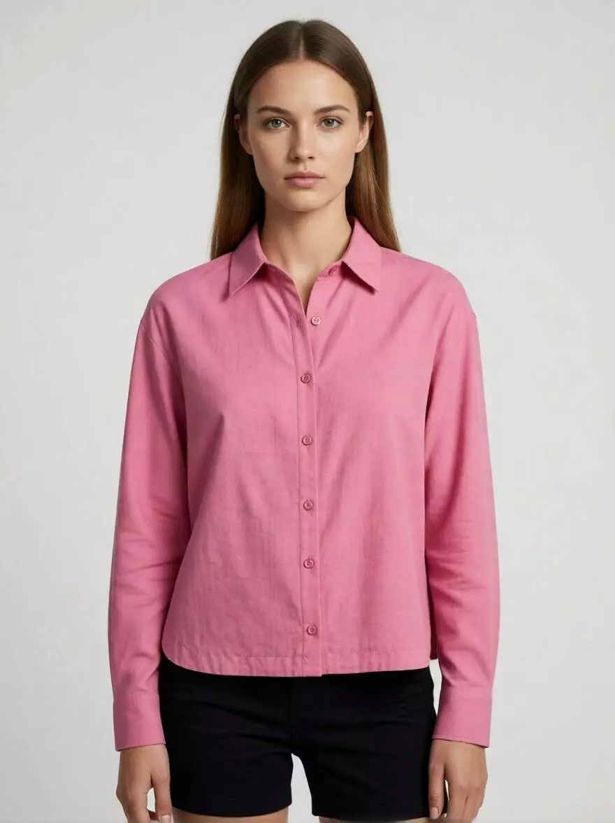 Ефектна жіноча сорочка укороченого фасону в ніжному та водночас насиченому рожевому кольорі. Ця модель стане яскравим акцентом у гардеробі, додаючи образу жіночності та весняної свіжості.