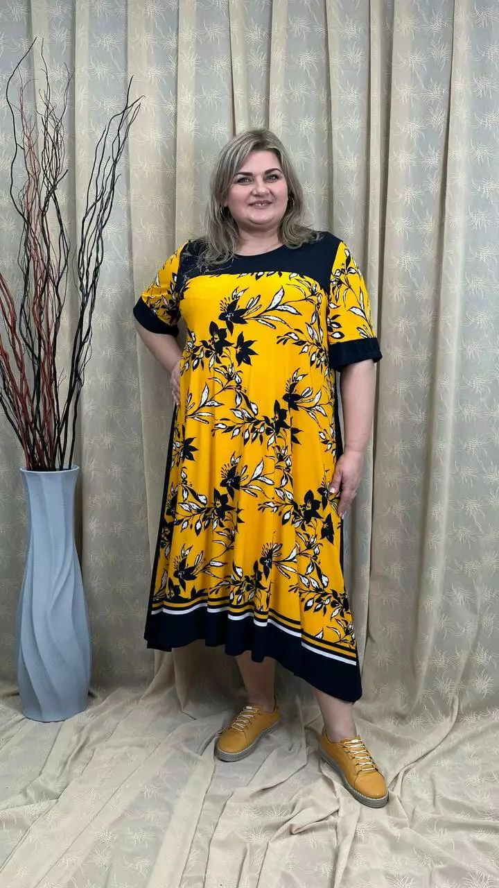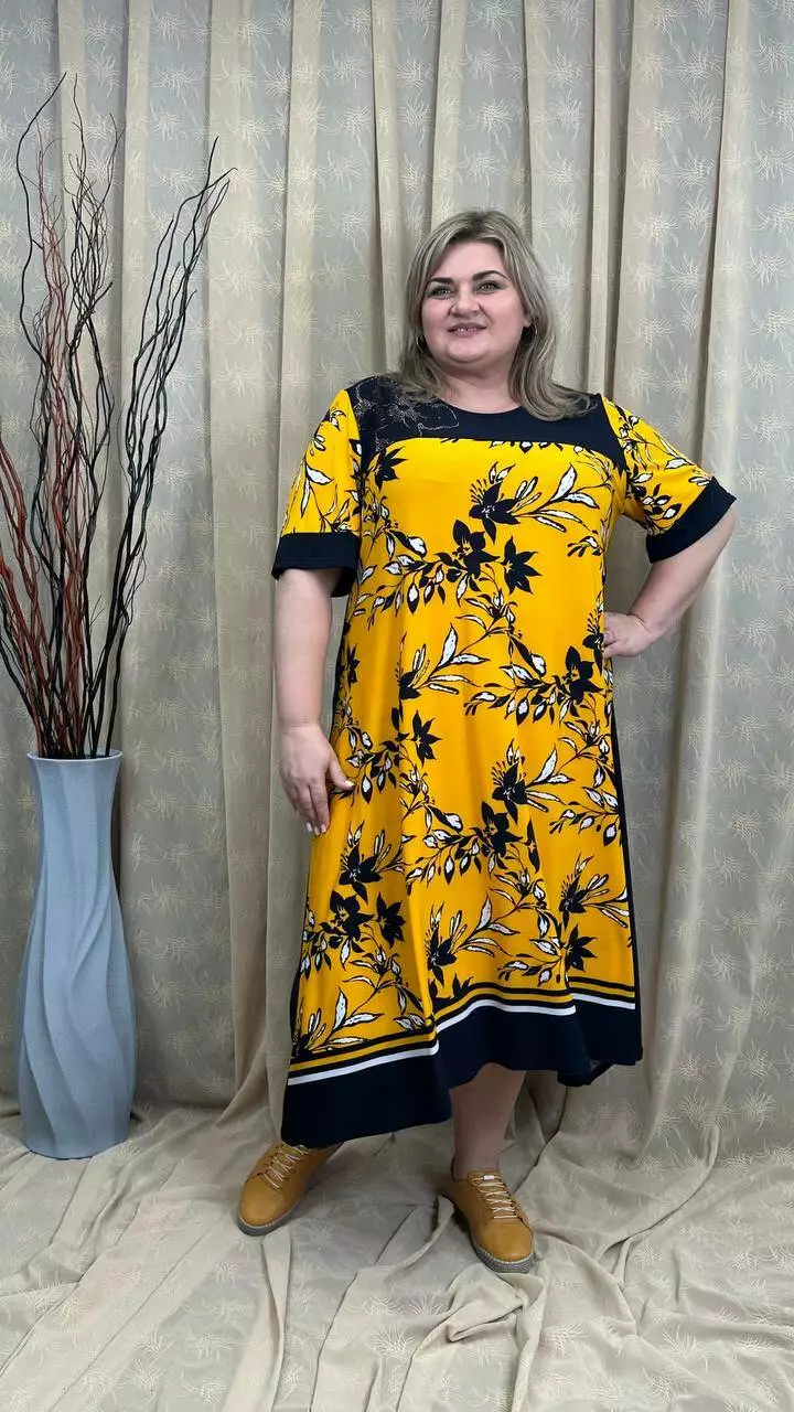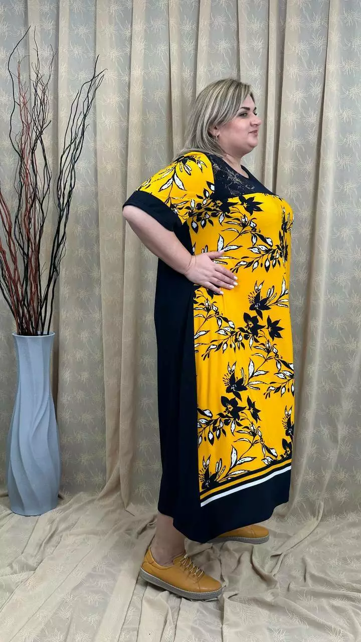 Розкльошена сукня з подовженими боками з трикотажу, олія п-ва Корея з гарною розтижністю. Тканина не меніться, не спекотна, не вимагає особливого догляду. Силует вільний, рукав втачний, на кокетці камінна аплікація.