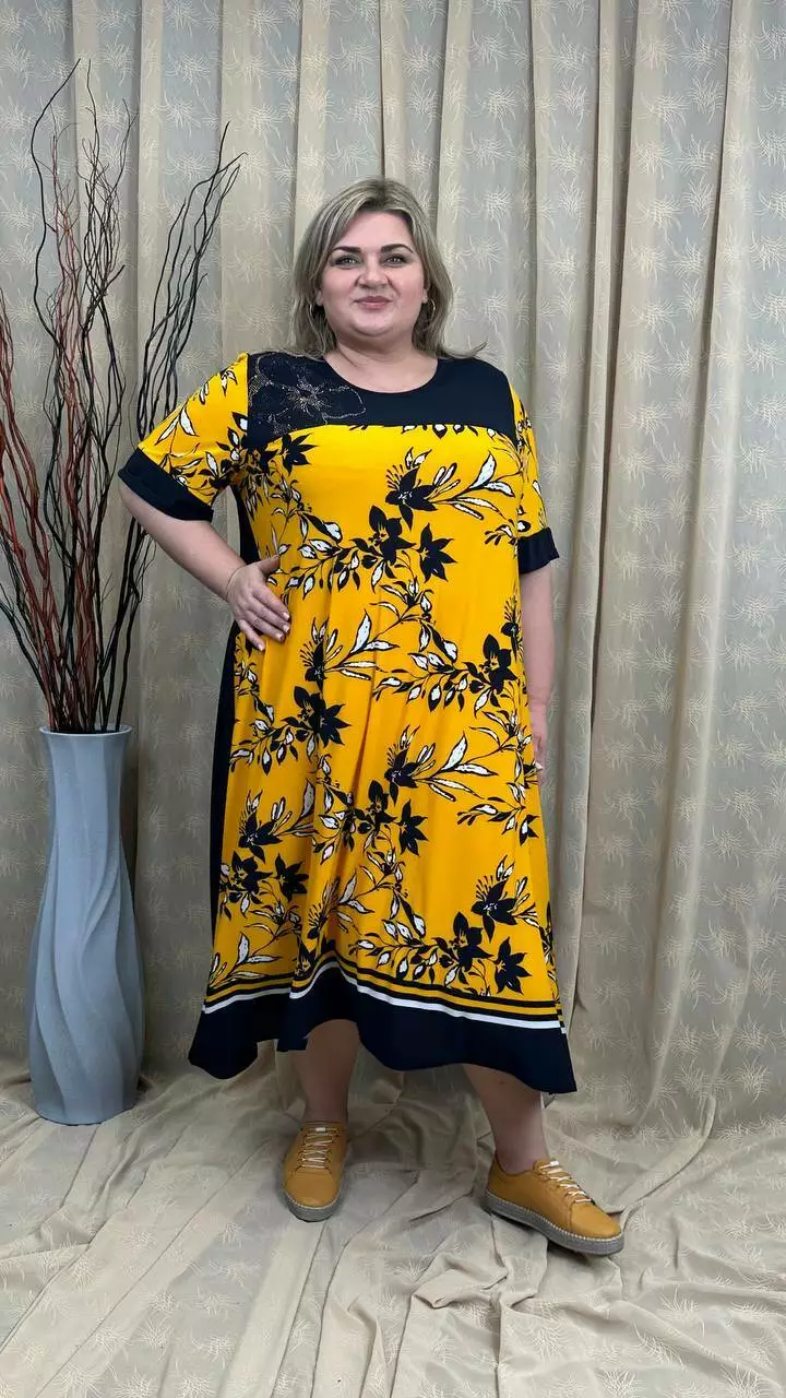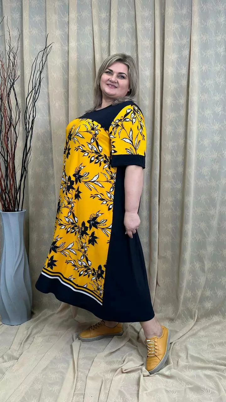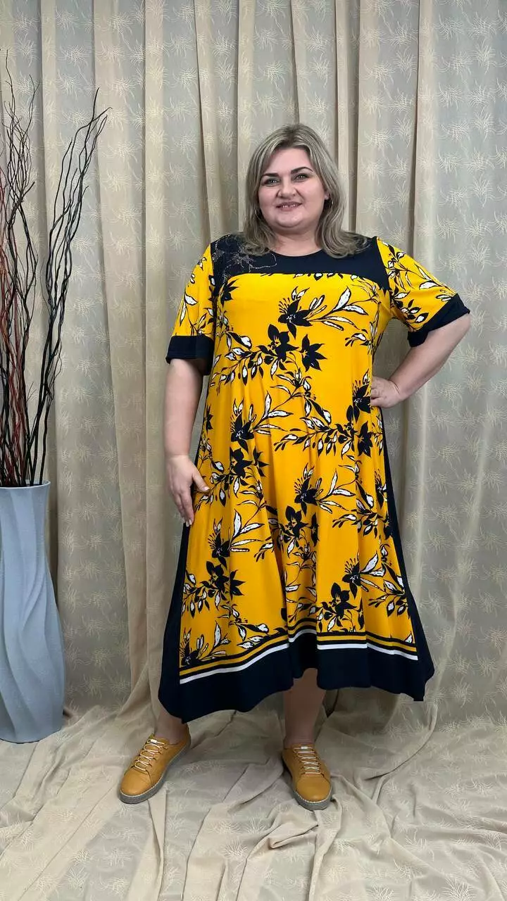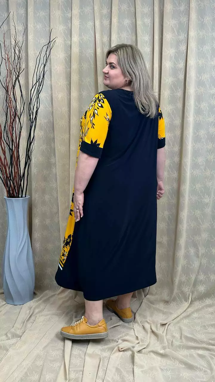 Розкльошена сукня з подовженими боками з трикотажу, олія п-ва Корея з гарною розтижністю. Тканина не меніться, не спекотна, не вимагає особливого догляду. Силует вільний, рукав втачний, на кокетці камінна аплікація.