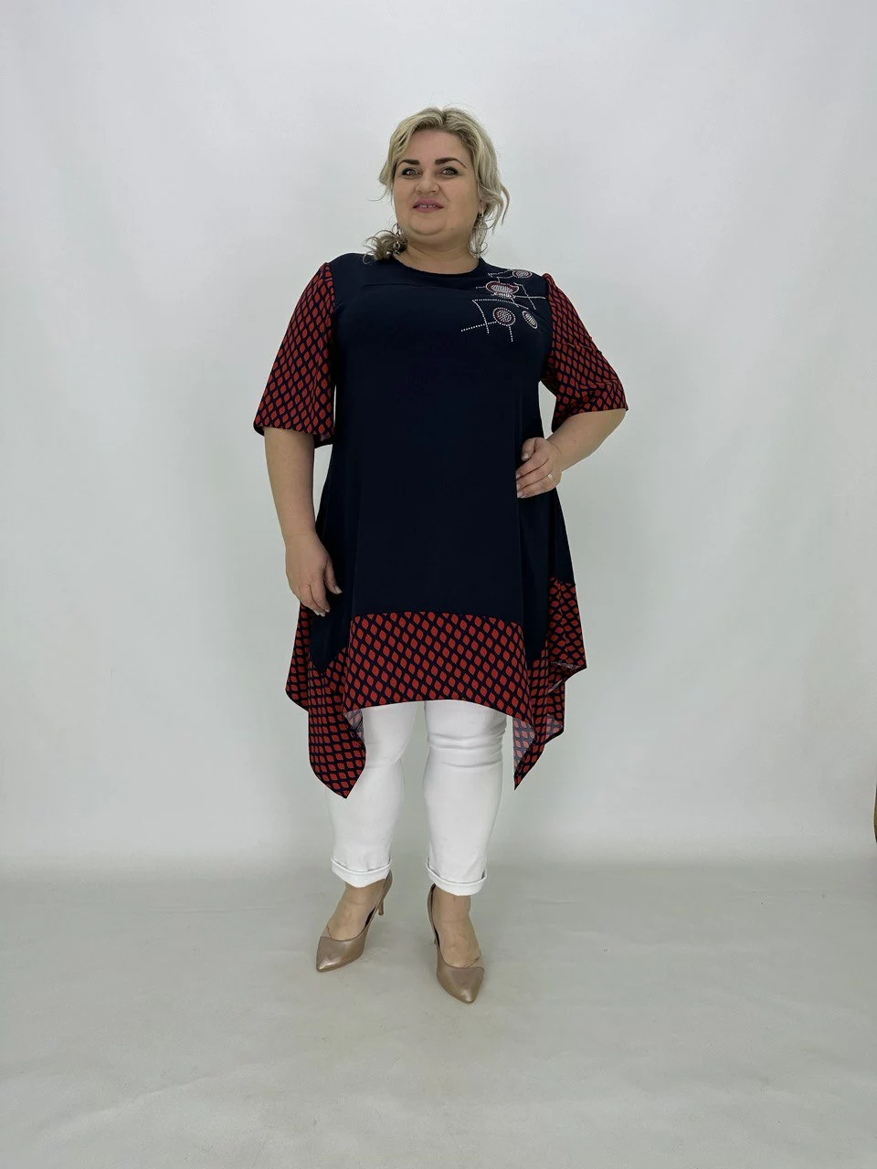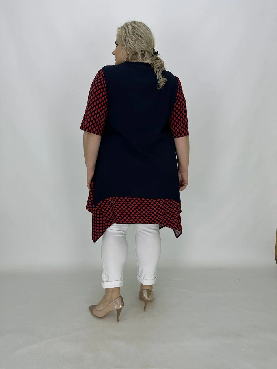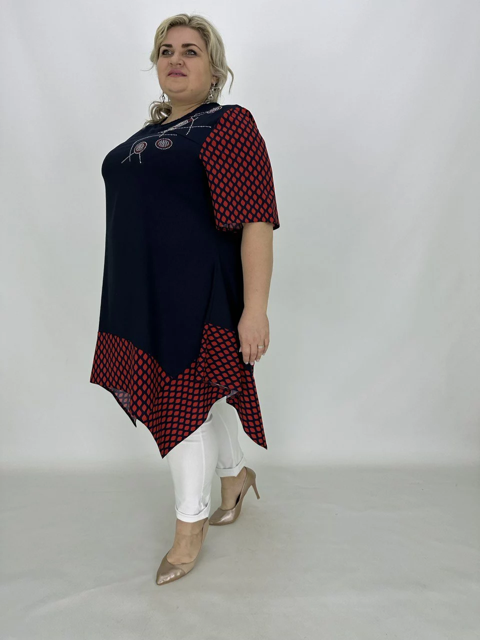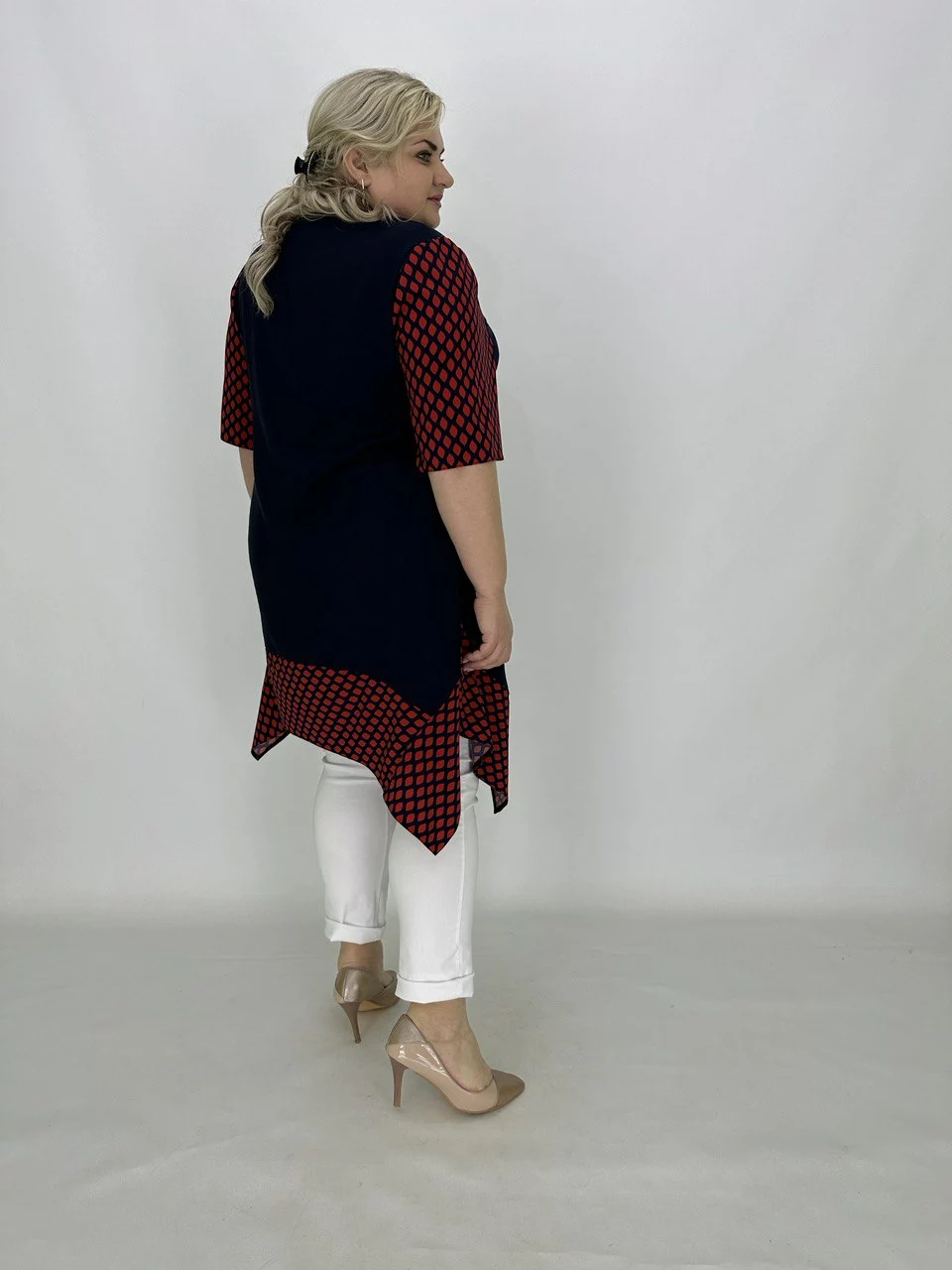 Розкльошена туніка з подовженими кутами.