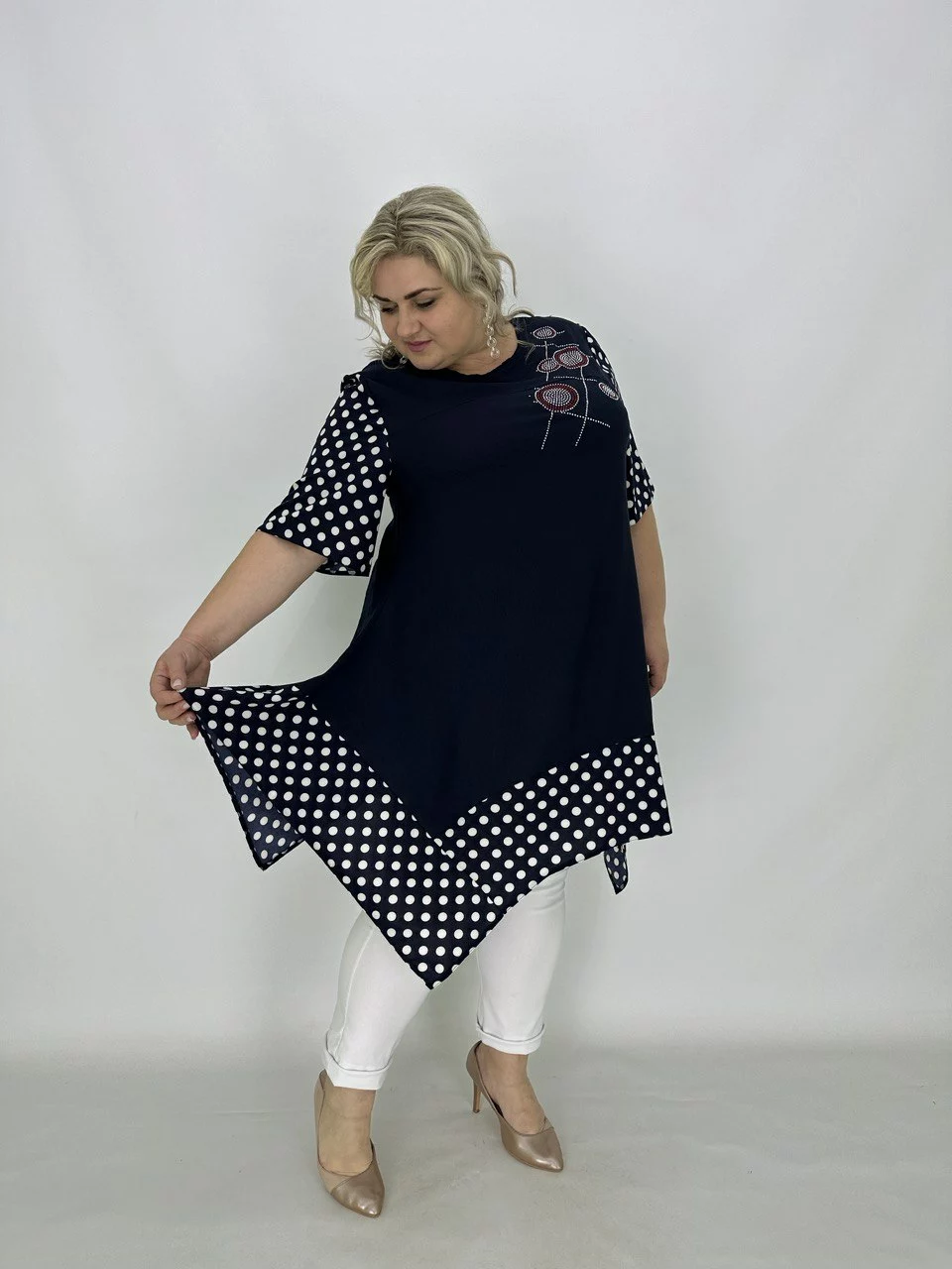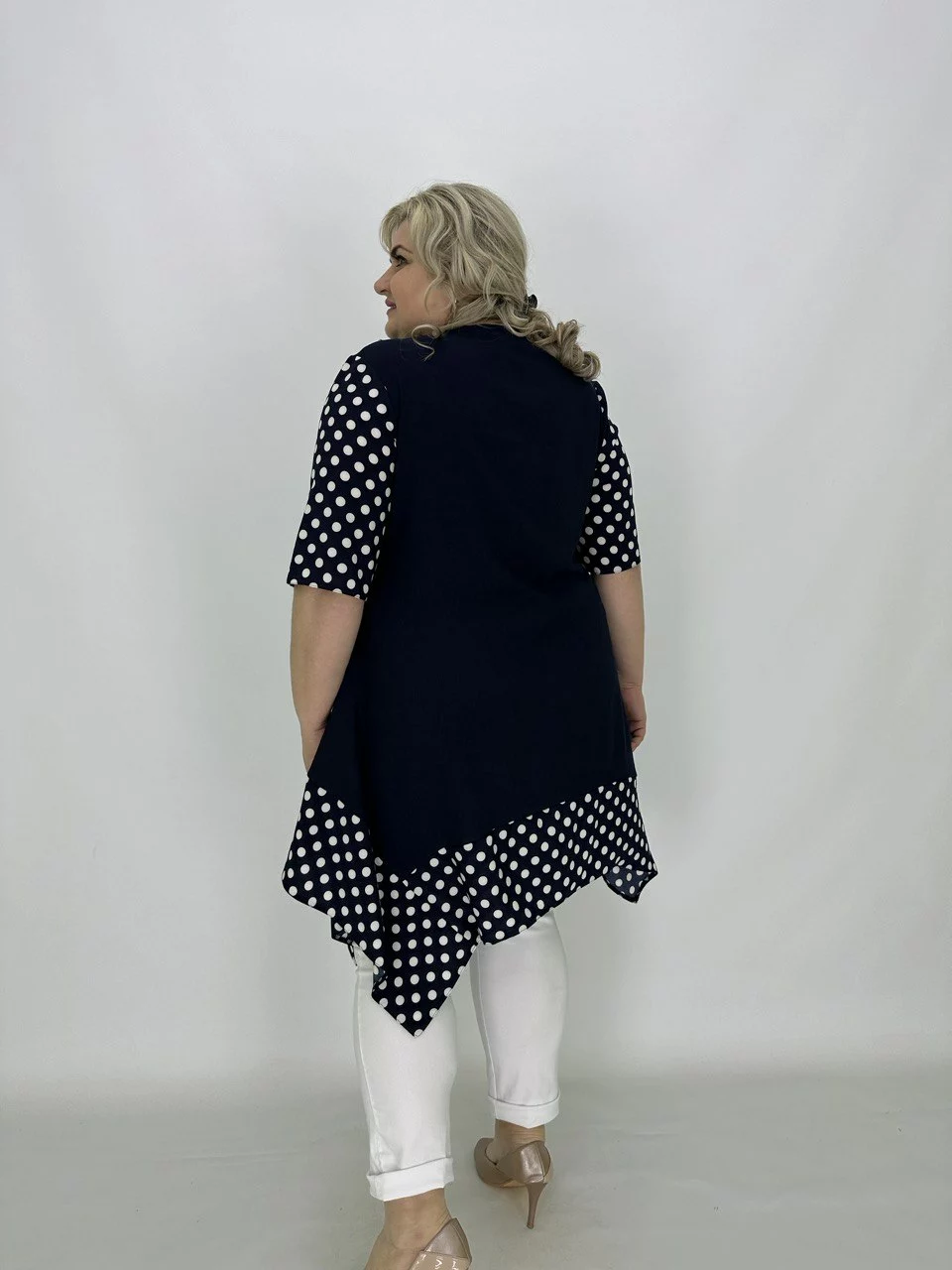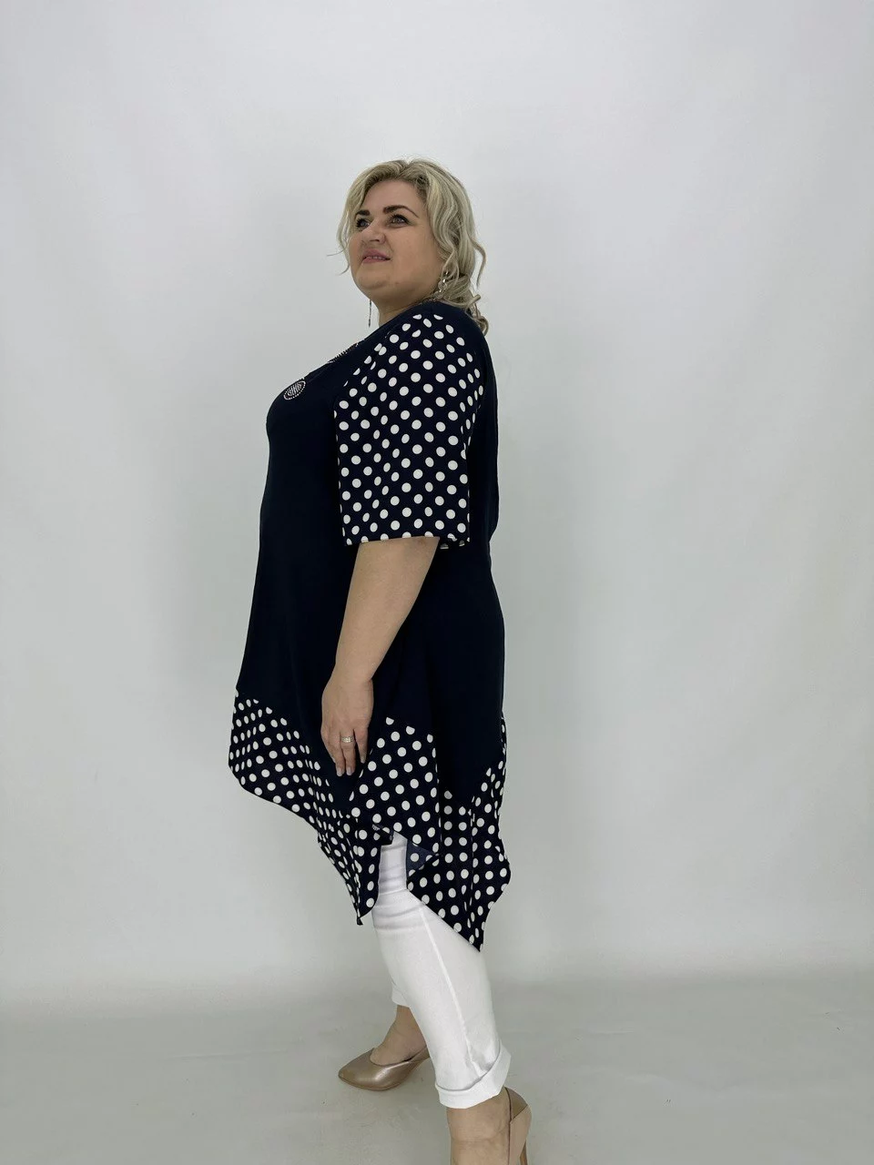Розкльошена туніка з подовженими кутами.