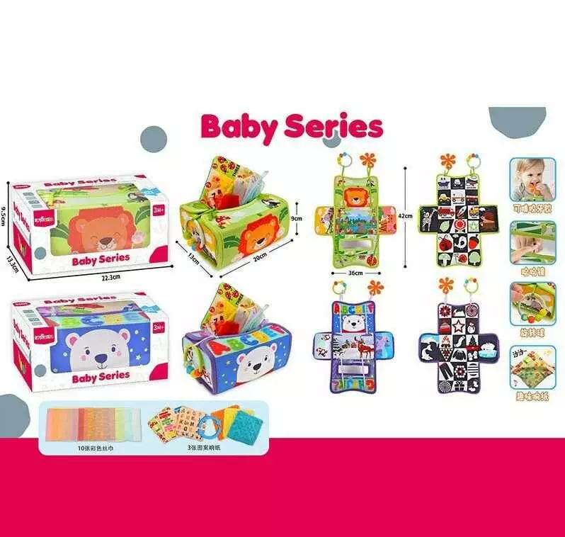 Розвиваюча гра 301 (60) 2 види, “Серветниця”, 10 фатинових серветок, шурхотять, прорізувач, брязкальце, англ. абетка, в коробці