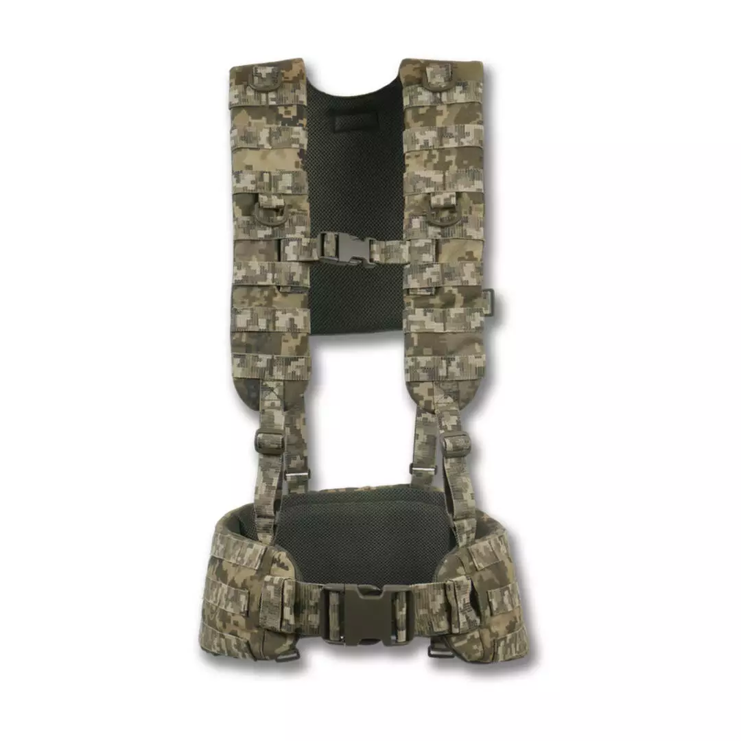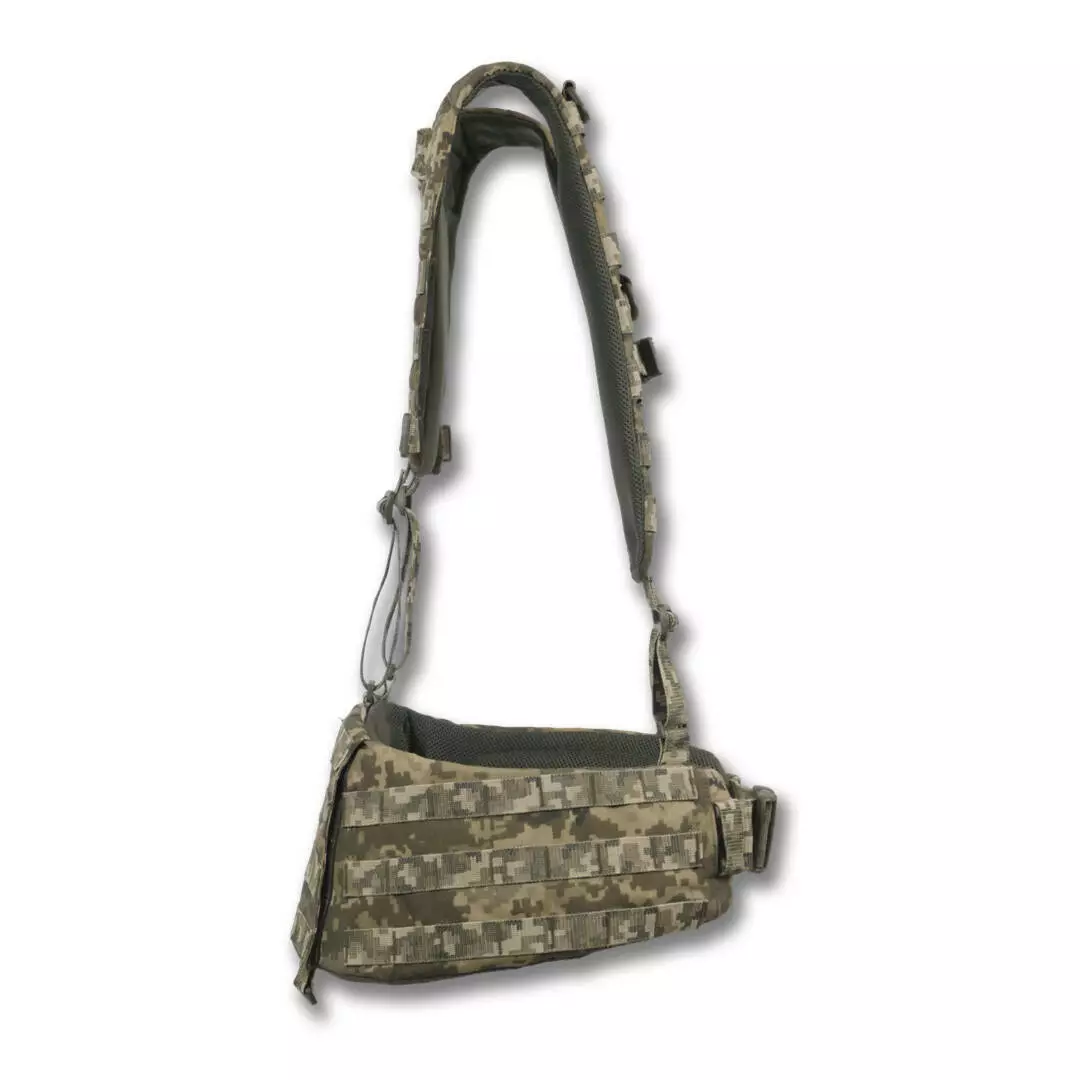 Конструкция. Плечевые лямки имеют рюкзачную конструкцию с ячейками MOLLE на спине для закрепления дополнительных итогов. Имеет внутренний слой полифома толщиной 5 мм и мягкую сетку для вентиляции. На лямках предусмотрено по 7 рядов MOLLE и нагрудный соединительный ремень на фастексе.
