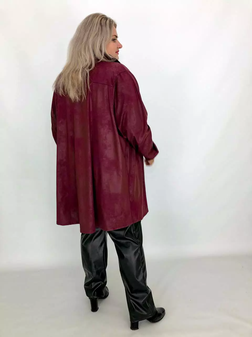 Тканина: екошкіра - 100% поліестер. Тканина екошкіри під замш на трикотажній основі, дуже м'яка, добре тягнеться. Силует вільний, рукав широкий - кажан. Підходить під будь-які груди. Застібається на кнопки. Прання-ручне без віджиму, гладити тільки з вивороту.