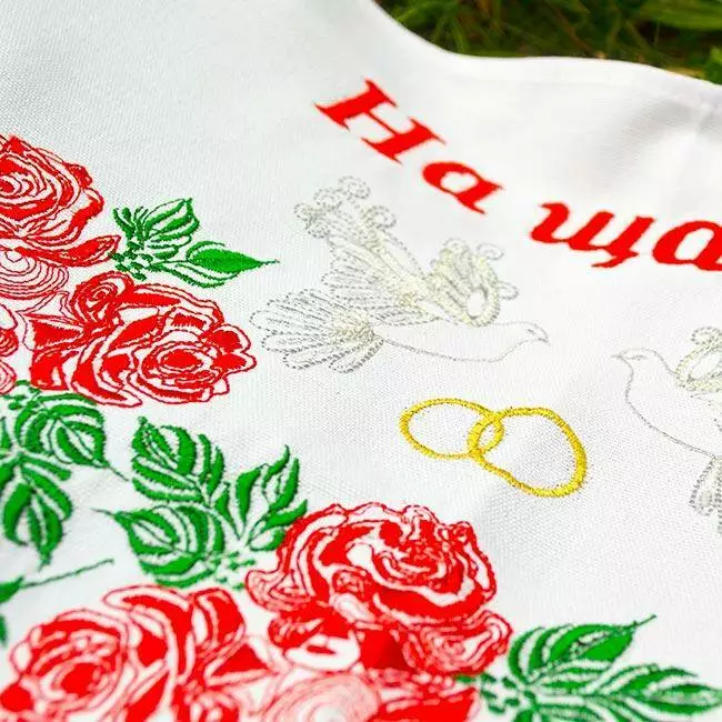 Тканий рушник "На щастя, на долю" по центру містить красиву вишивку, виконану в техніці "машинна гладь". Голуби і обручки вишиті блискучими нитками.
