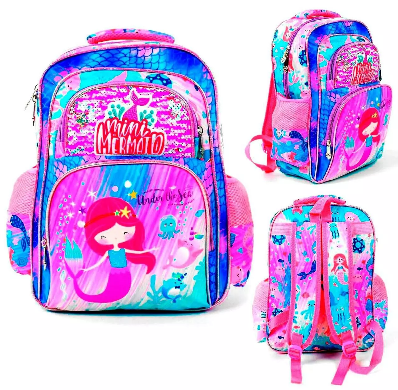 основанию нарисованы десятки водных обитателей и русалок. Портфель
