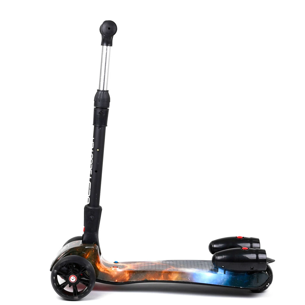 Самокат с турбиной, дымом и музыкой Scooter один из лучших детских самокатов, он надёжный, устойчивый, лёгкий, рулевая стойка регулируется по высоте - растёт вместе с ребёнком. Новая модель со встроенными светящимися турбинами, пускающими дым. Турбины издают звук двигателя. Так же есть музыка. Для выпускания дыма в турбины нужно заливать воду. Для включения на турбинах расположены 2 кнопки - нужно нажимать их обе, одна из них переключает режимы музыки. В будущем турбины можно полностью открутить с самоката. Характеристики: