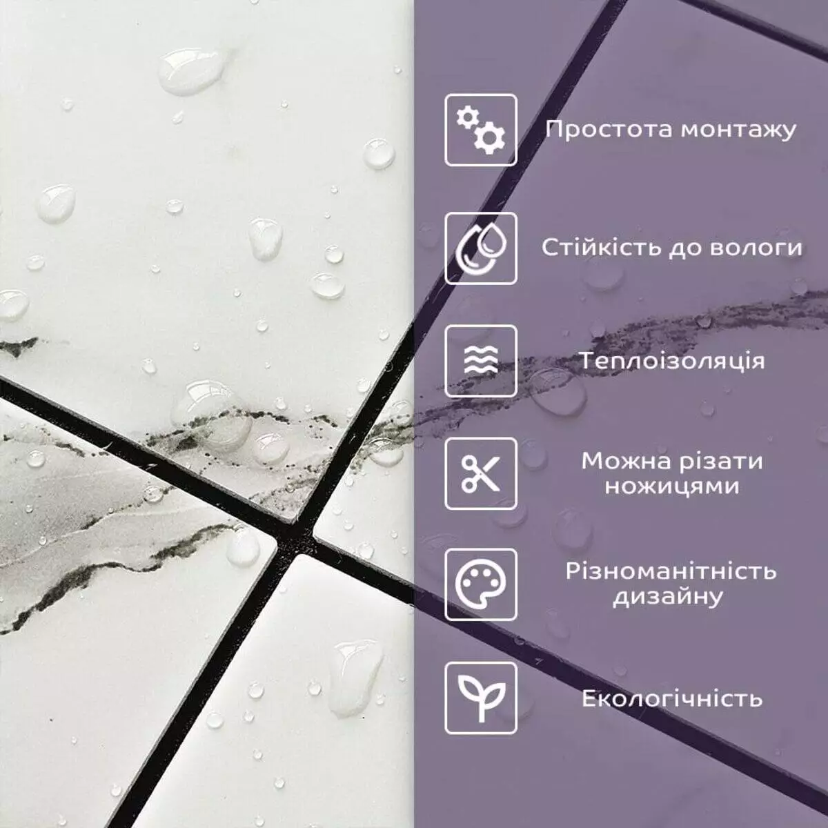 • Стійкість до вологи: матеріал стійкий до впливу вологи та пари, а також до появи плісняви, що робить його придатним для використання у приміщеннях з високою вологістю, таких як ванни та кухні. Плитка підходить для створення фартуха кухні, можна клеїти біля плити на відстані не менше ніж 20-25 см;