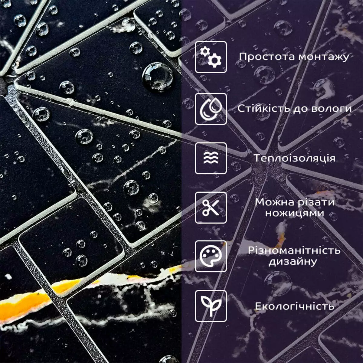 • Стійкість до вологи: матеріал стійкий до впливу вологи та пари, а також до появи плісняви, що робить його придатним для використання у приміщеннях з високою вологістю, таких як ванни та кухні. Плитка підходить для створення фартуха кухні, можна клеїти біля плити на відстані не менше ніж 20-25 см;