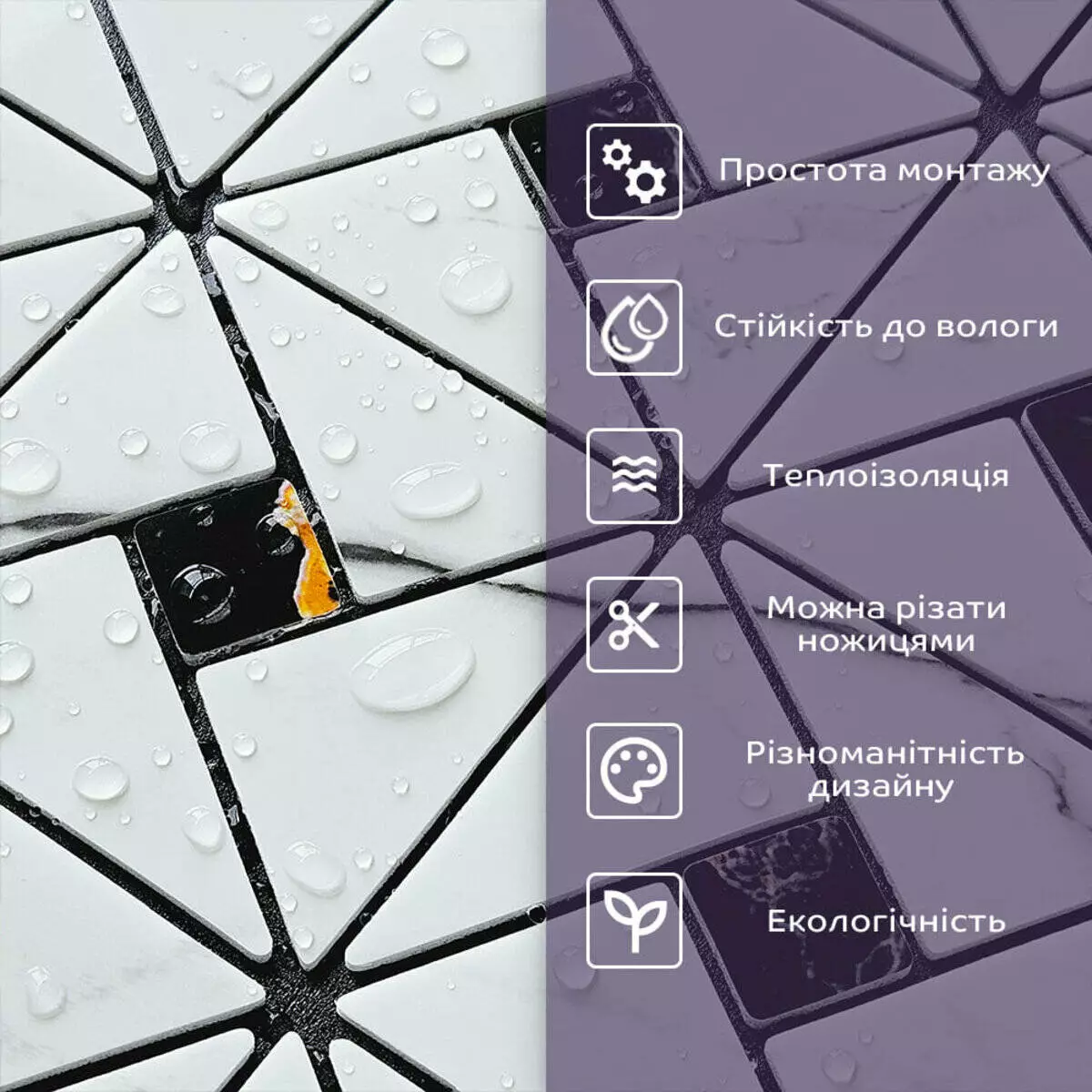 • Стійкість до вологи: матеріал стійкий до впливу вологи та пари, а також до появи плісняви, що робить його придатним для використання у приміщеннях з високою вологістю, таких як ванни та кухні. Плитка підходить для створення фартуха кухні, можна клеїти біля плити на відстані не менше ніж 20-25 см;