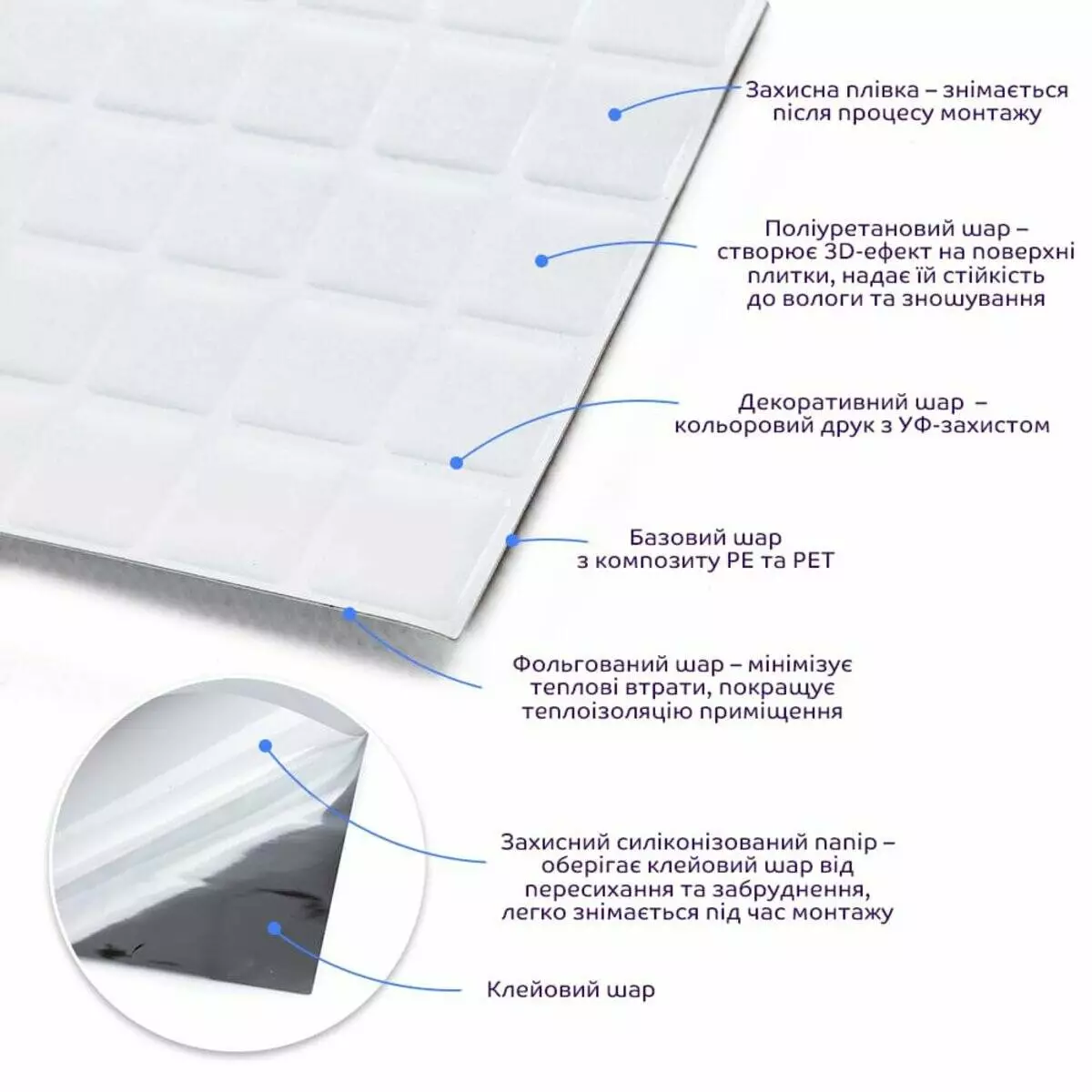 • Захисна плівка: зберігає поліуретанову поверхню від подряпин, відколів та інших механічних пошкоджень у процесі транспортування. Після проведення монтажу плівка знімається з поверхні плитки.