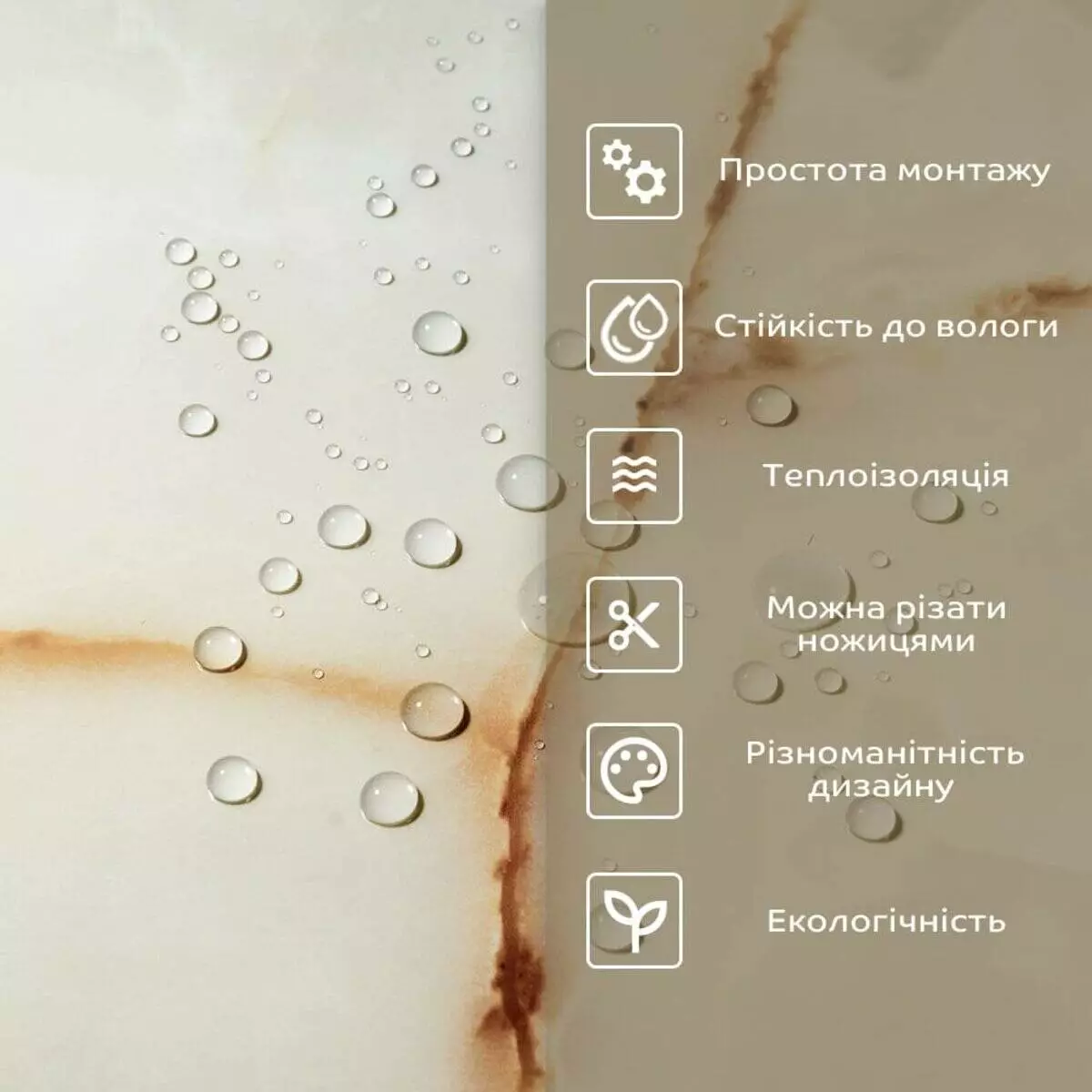 • 2. Стійкість до вологи: матеріал стійкий до впливу вологи та пари, а також до появи плісняви, що робить його придатним для використання у приміщеннях з високою вологістю, таких як ванни та кухні. Плитка підходить для створення фартуха кухні, можна клеїти біля плити на відстані не менше ніж 20-25 см;