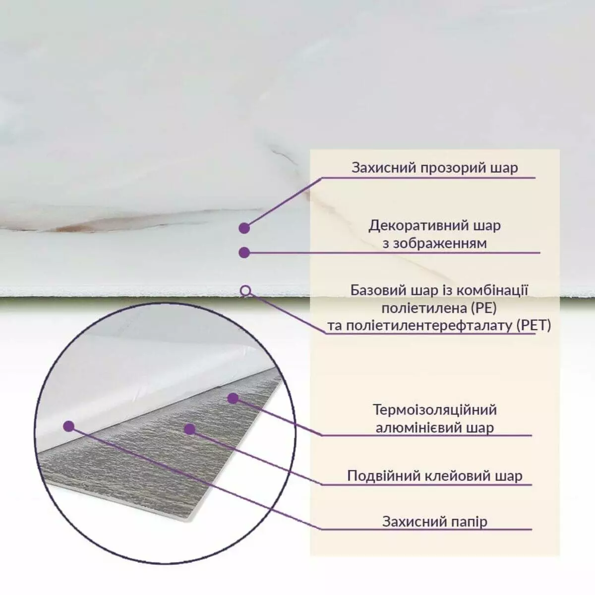 • Базовий шар з комбинації поліетилена (PE) і поліетилентерефталату (PET)