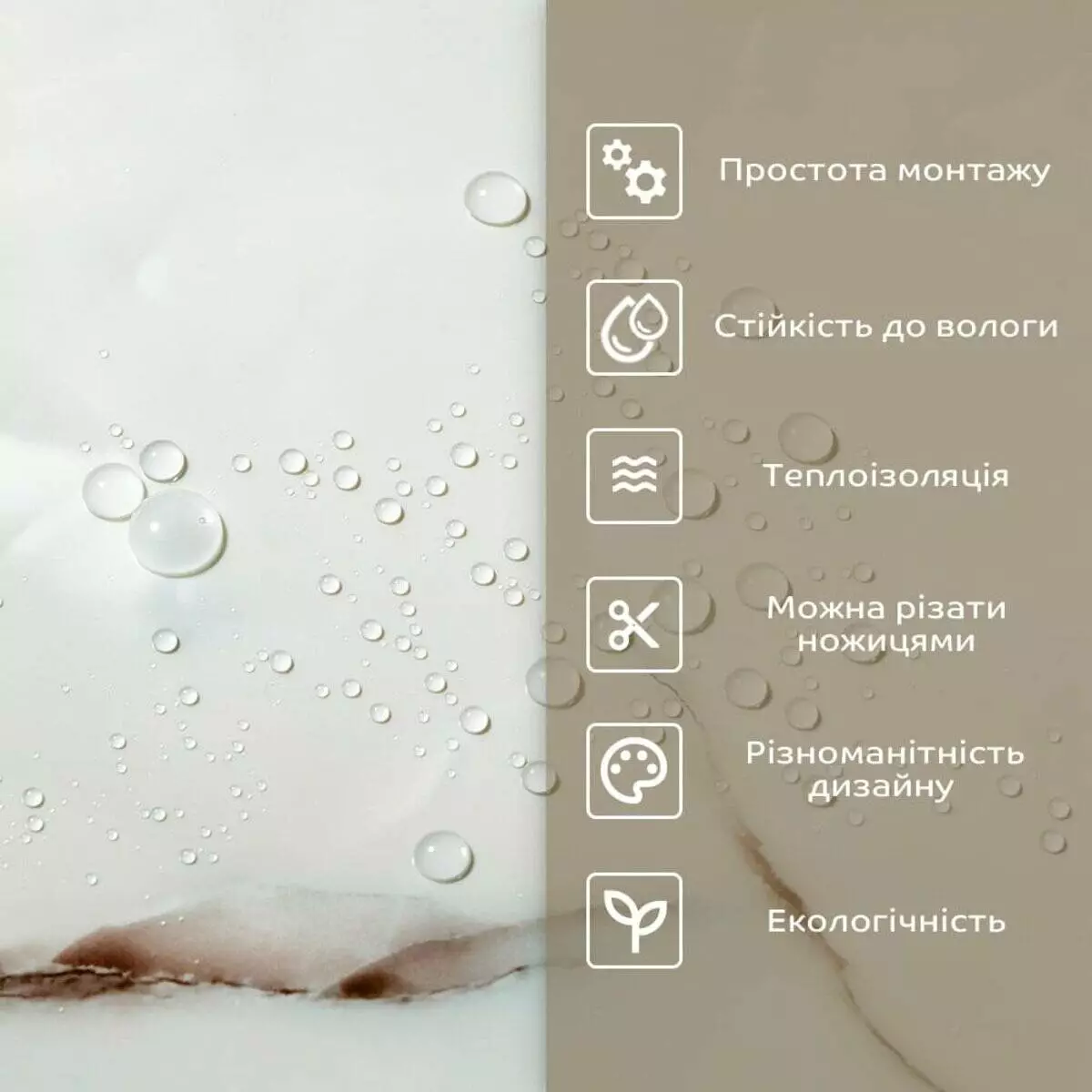 • 2. Стійкість до вологи: матеріал стійкий до впливу вологи та пари, а також до появи плісняви, що робить його придатним для використання у приміщеннях з високою вологістю, таких як ванни та кухні. Плитка підходить для створення фартуха кухні, можна клеїти біля плити на відстані не менше ніж 20-25 см;