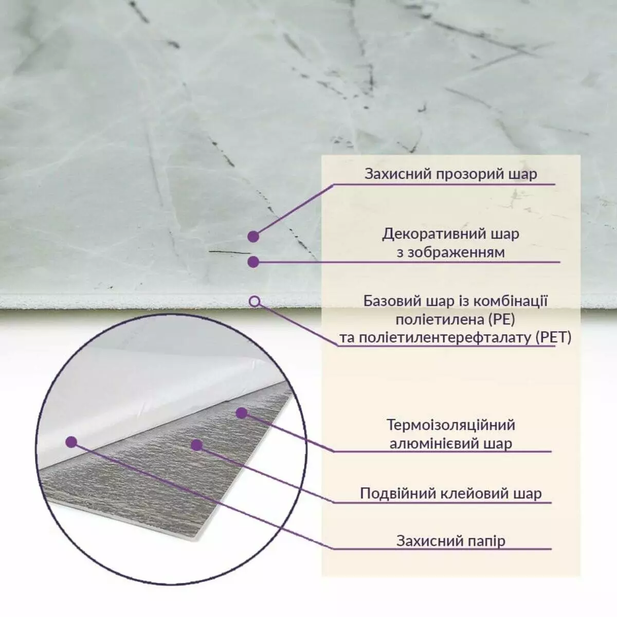 • Базовий шар з комбинації поліетилена (PE) і поліетилентерефталату (PET)