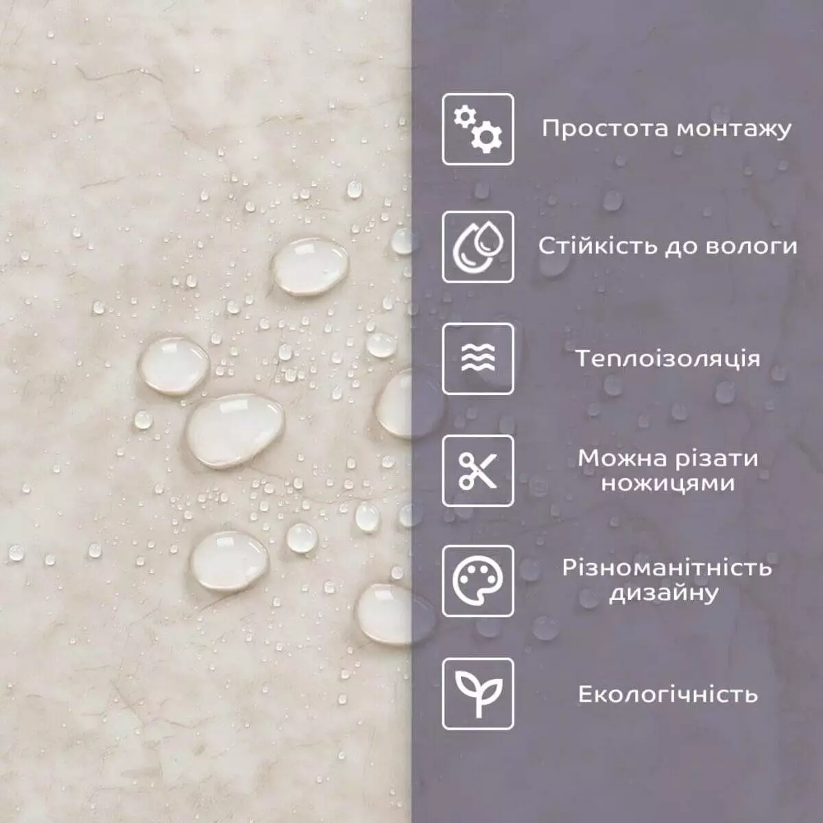 • 2. Стійкість до вологи: матеріал стійкий до впливу вологи та пари, а також до появи плісняви, що робить його придатним для використання у приміщеннях з високою вологістю, таких як ванни та кухні. Плитка підходить для створення фартуха кухні, можна клеїти біля плити на відстані не менше ніж 20-25 см;