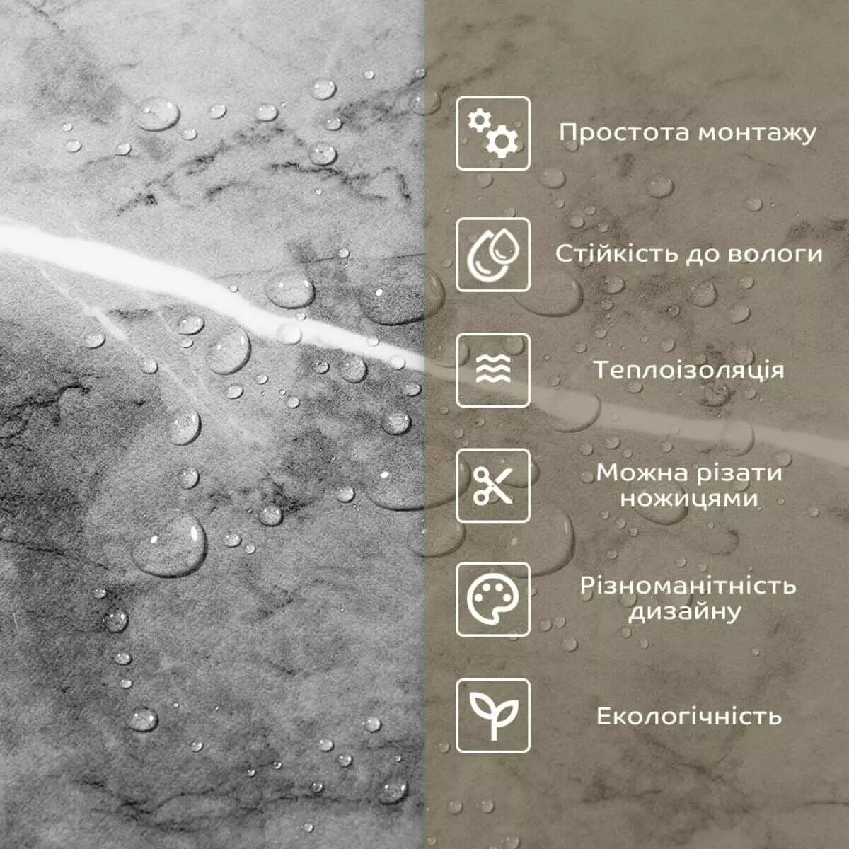 • 2. Стійкість до вологи: матеріал стійкий до впливу вологи та пари, а також до появи плісняви, що робить його придатним для використання у приміщеннях з високою вологістю, таких як ванни та кухні. Плитка підходить для створення фартуха кухні, можна клеїти біля плити на відстані не менше ніж 20-25 см;