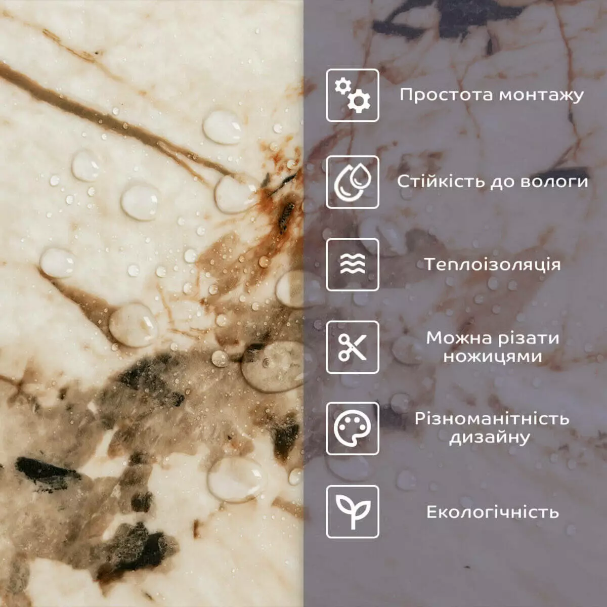 • 2. Стійкість до вологи: матеріал стійкий до впливу вологи та пари, а також до появи плісняви, що робить його придатним для використання у приміщеннях з високою вологістю, таких як ванни та кухні. Плитка підходить для створення фартуха кухні, можна клеїти біля плити на відстані не менше ніж 20-25 см;
