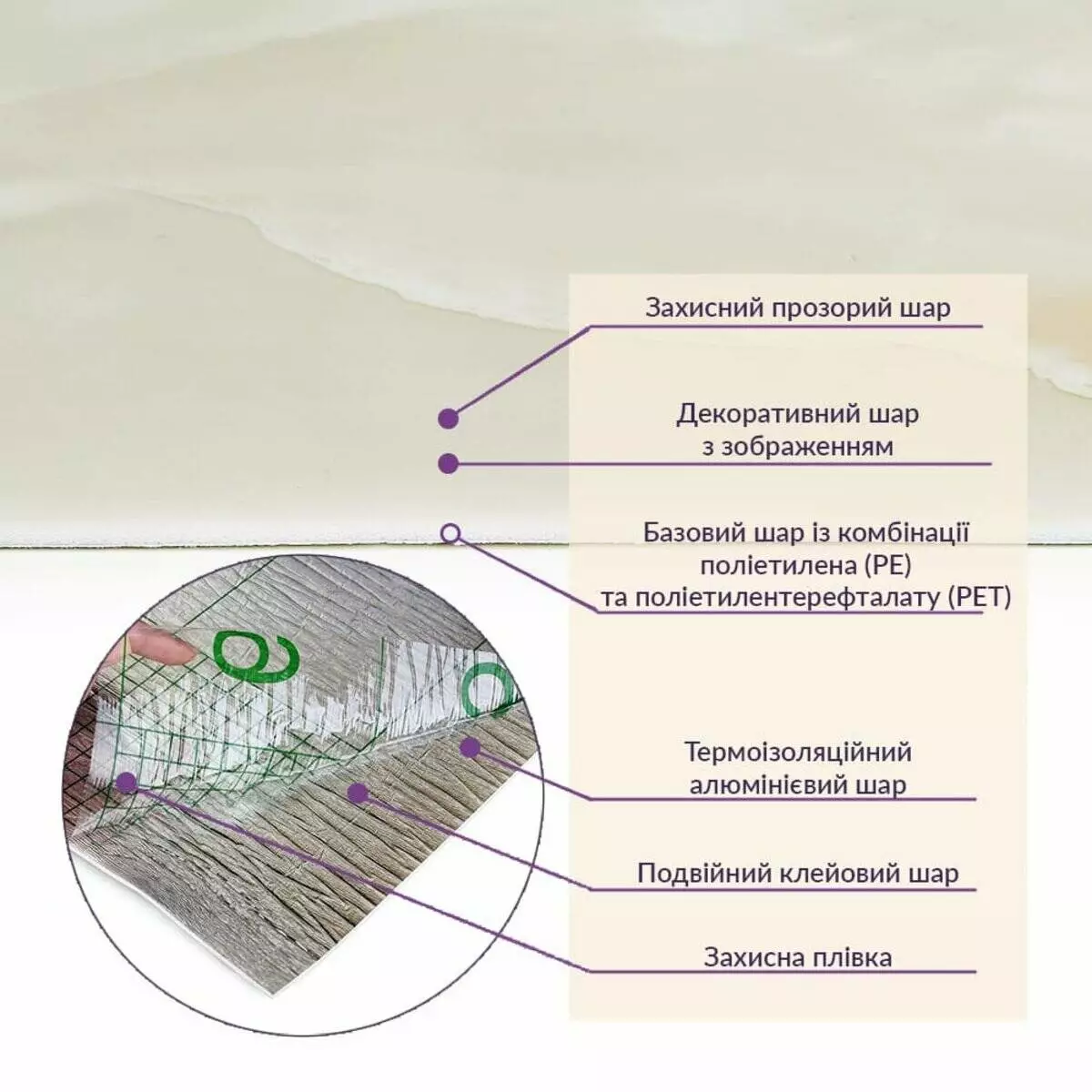 • Базовий шар з комбинації поліетилена (PE) і поліетилентерефталату (PET)