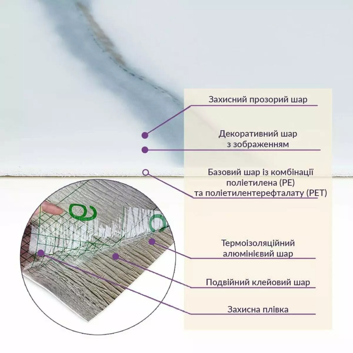• Базовий шар з комбинації поліетилена (PE) і поліетилентерефталату (PET)